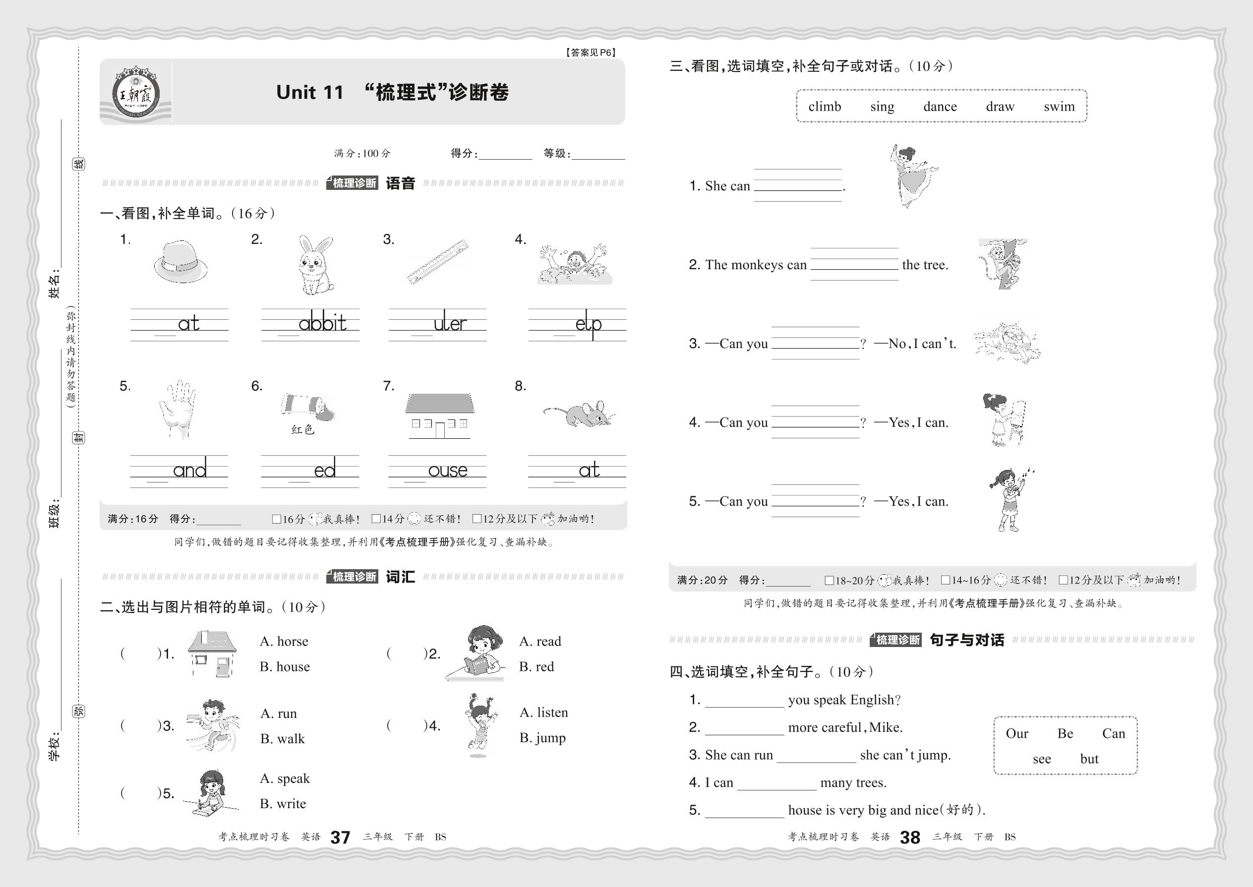 2024春下册三年级英语北师版 Unit 11 “梳理式”诊断卷