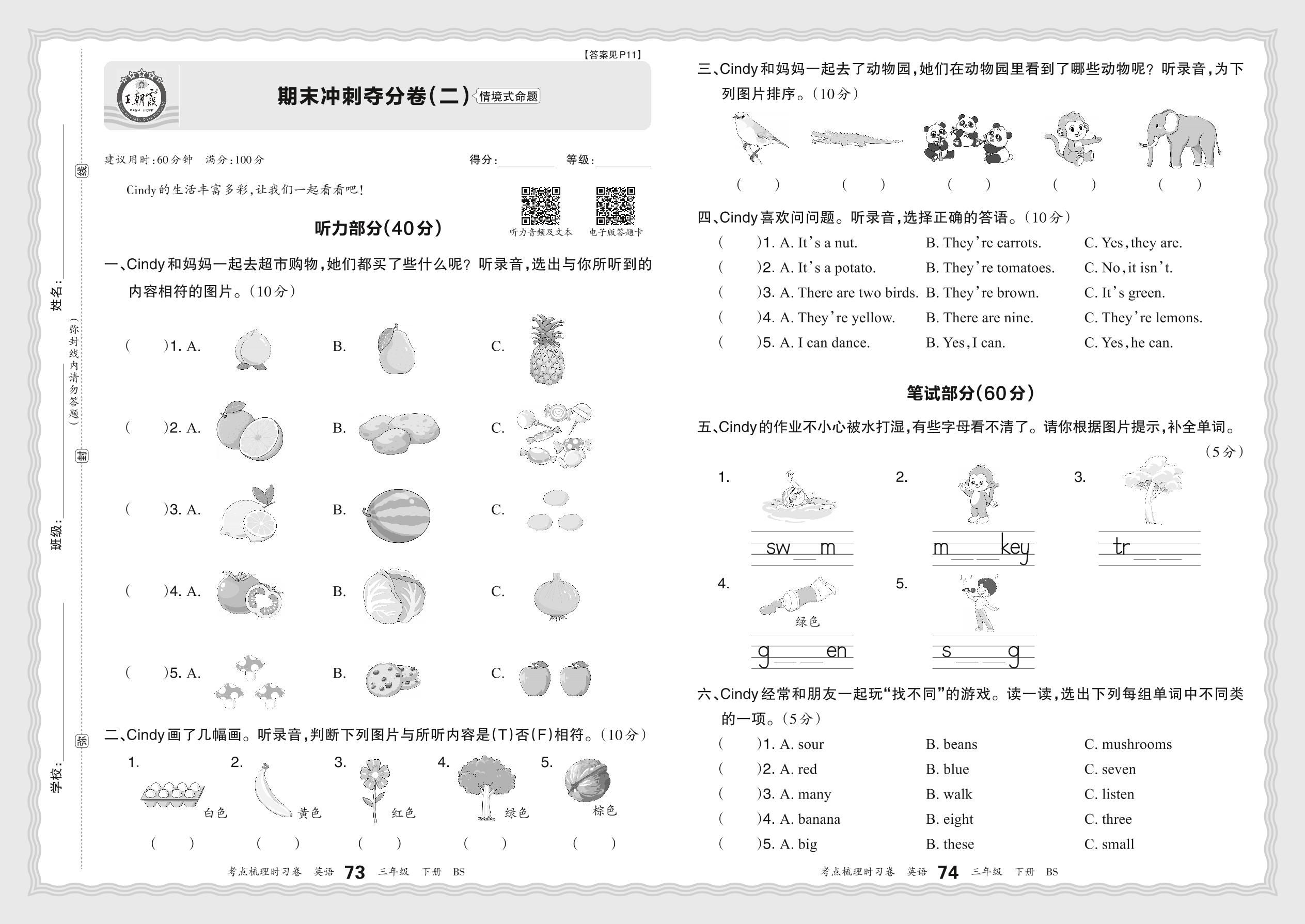 2024春下册三年级英语北师版 期末冲刺夺分卷(二)