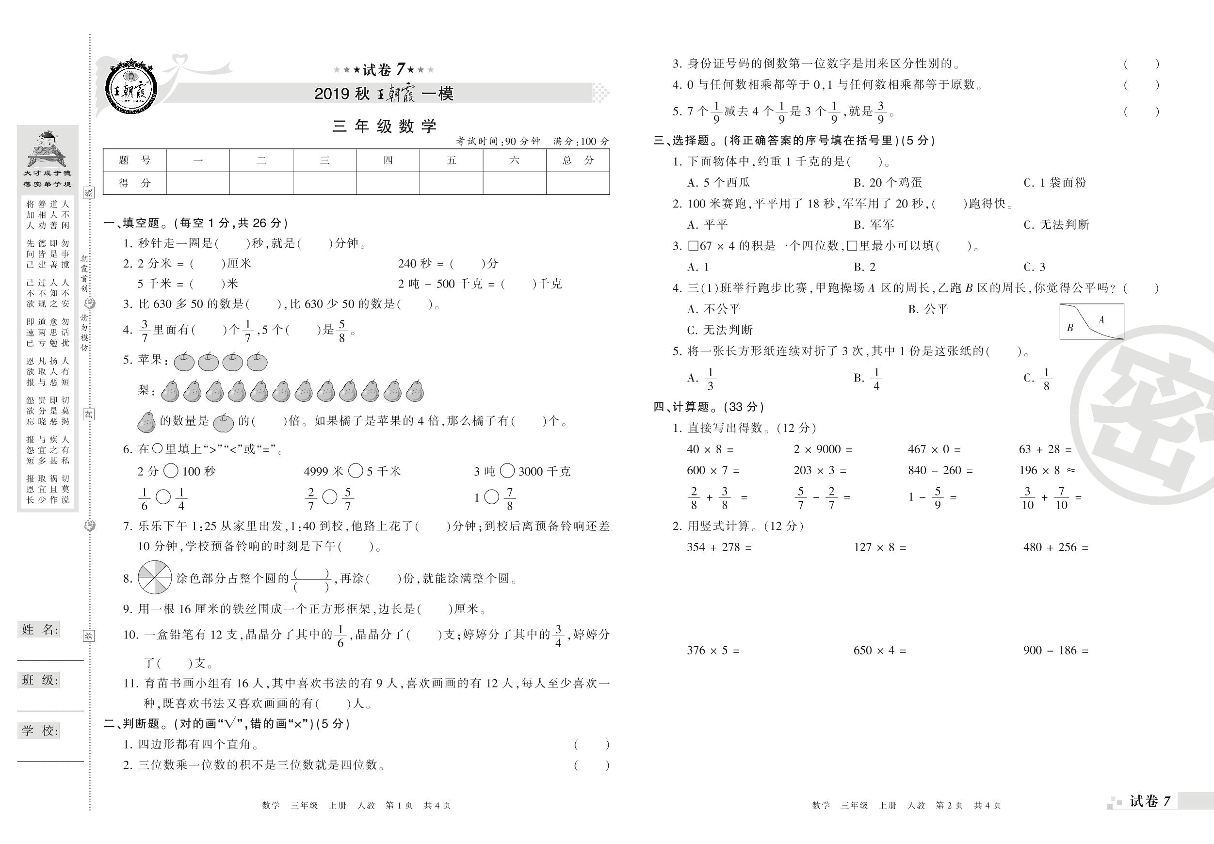 王朝霞期末模拟卷三年级上册数学(人教版)_R21080495812【7】