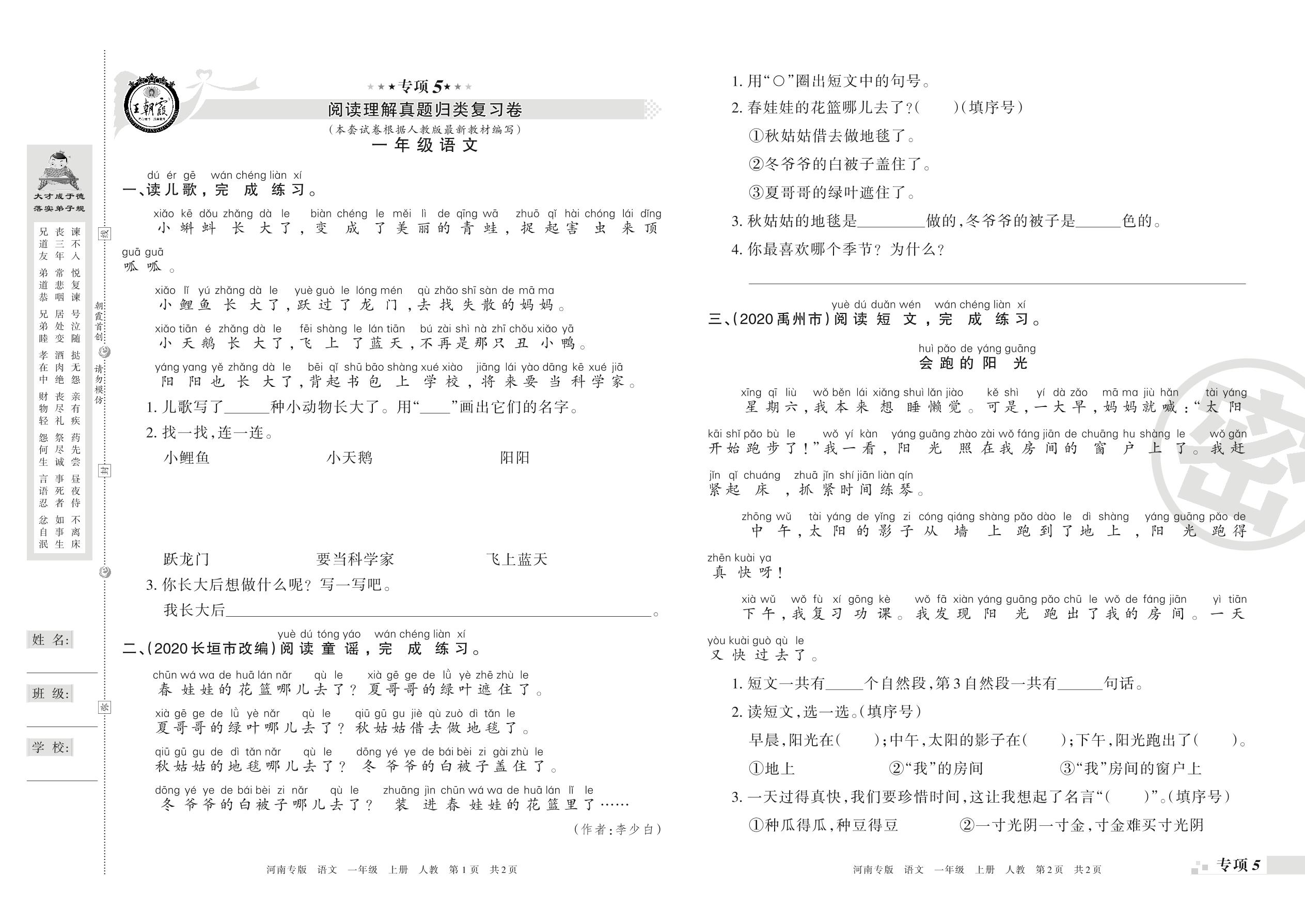 王朝霞期末专项卷——阅读理解、写话真题归类复习一年级上册语文(人教版)_R210731173719【0】