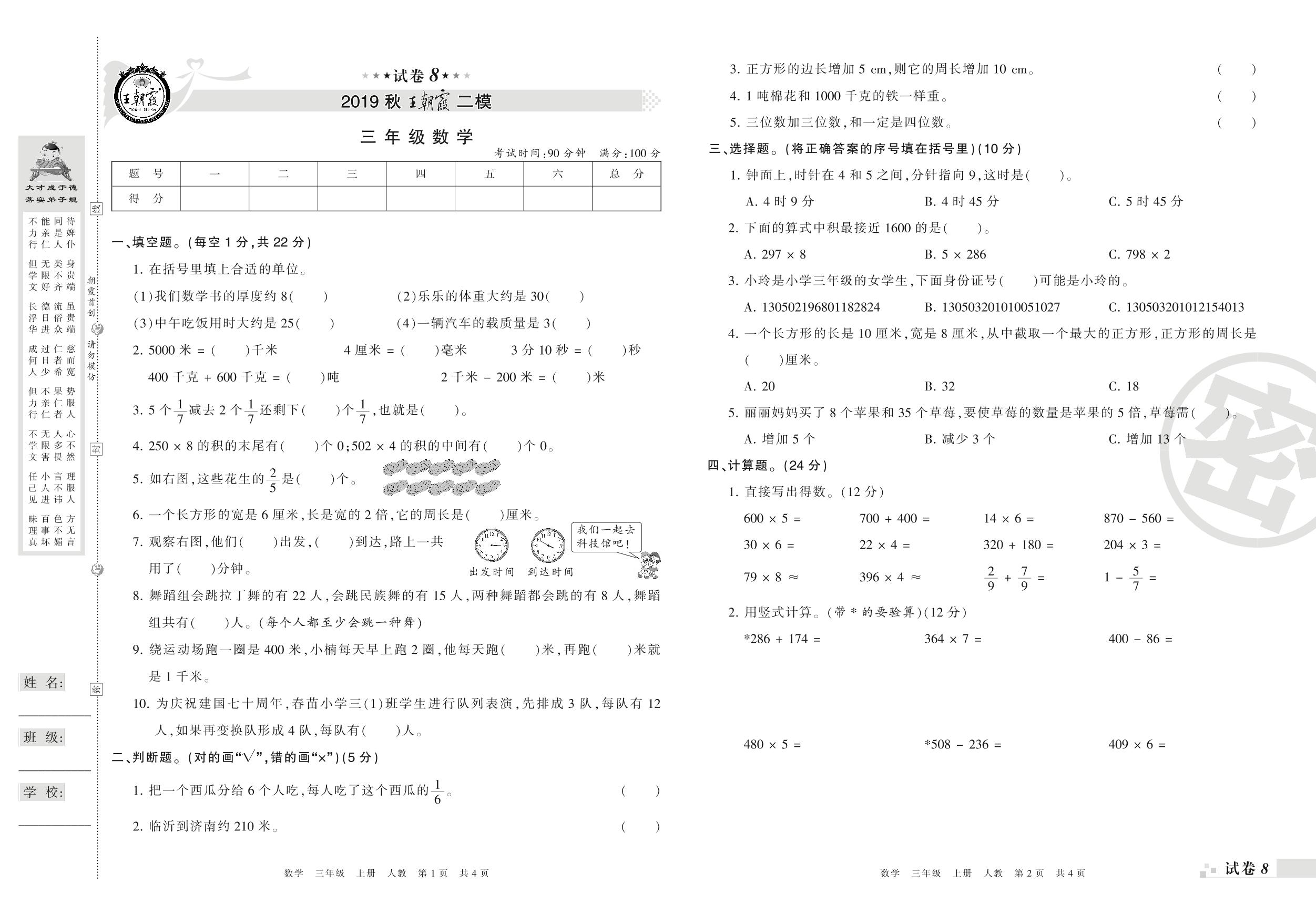 王朝霞期末模拟卷三年级上册数学(人教版)_R21080495818【8】