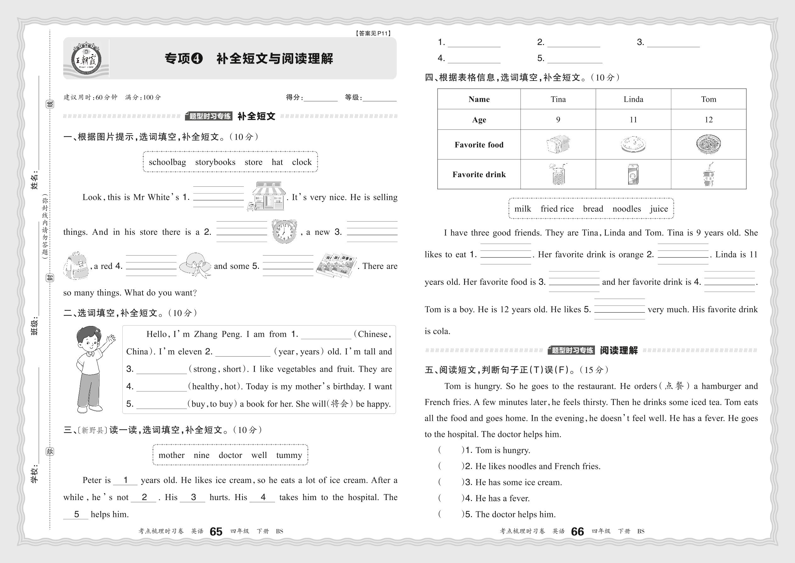 2024春下册四年级英语北师版 期末专项卷KD版·补全短文与阅读理解【4】