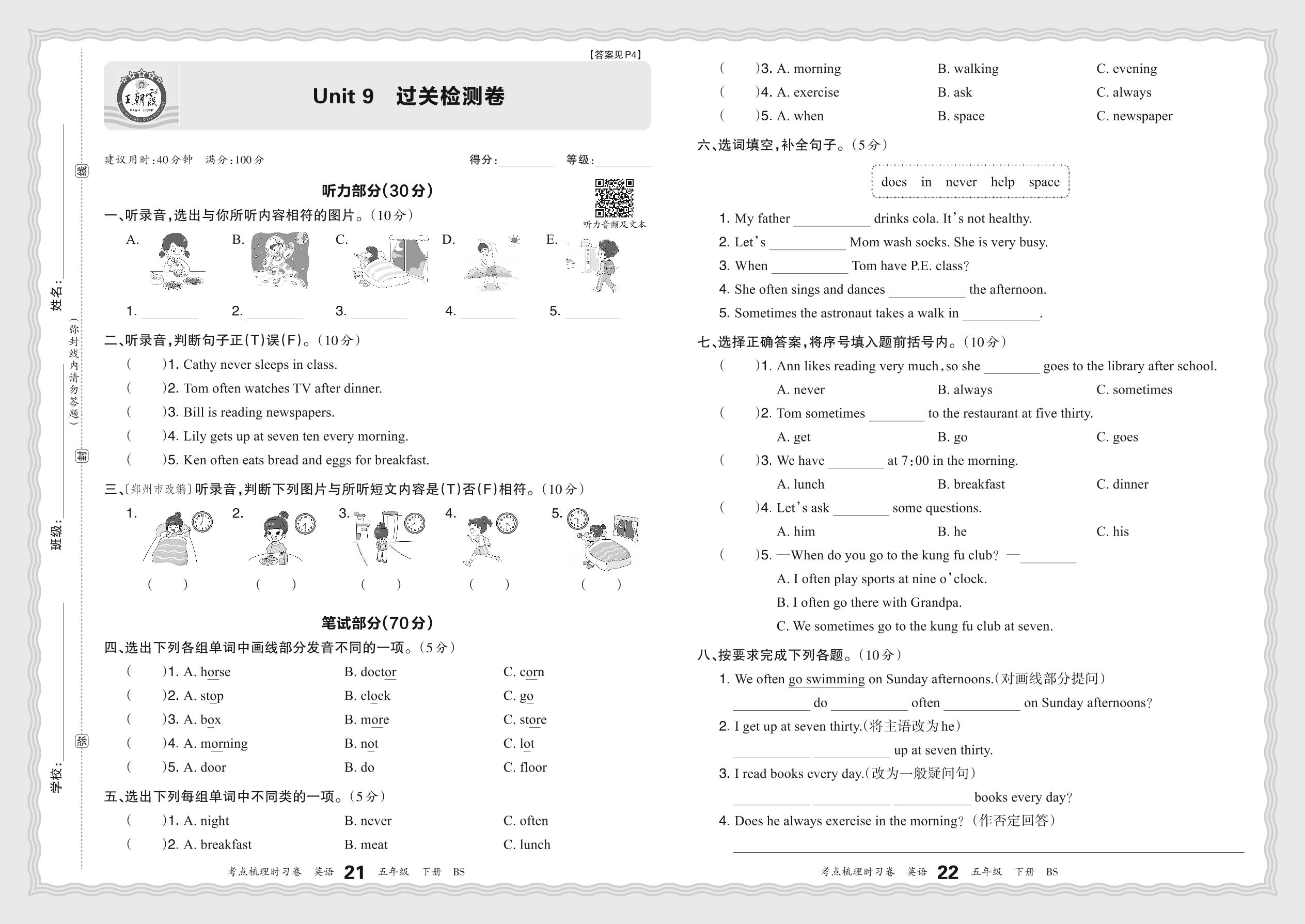 2024春下册五年级英语北师版 Unit 9 过关检测卷
