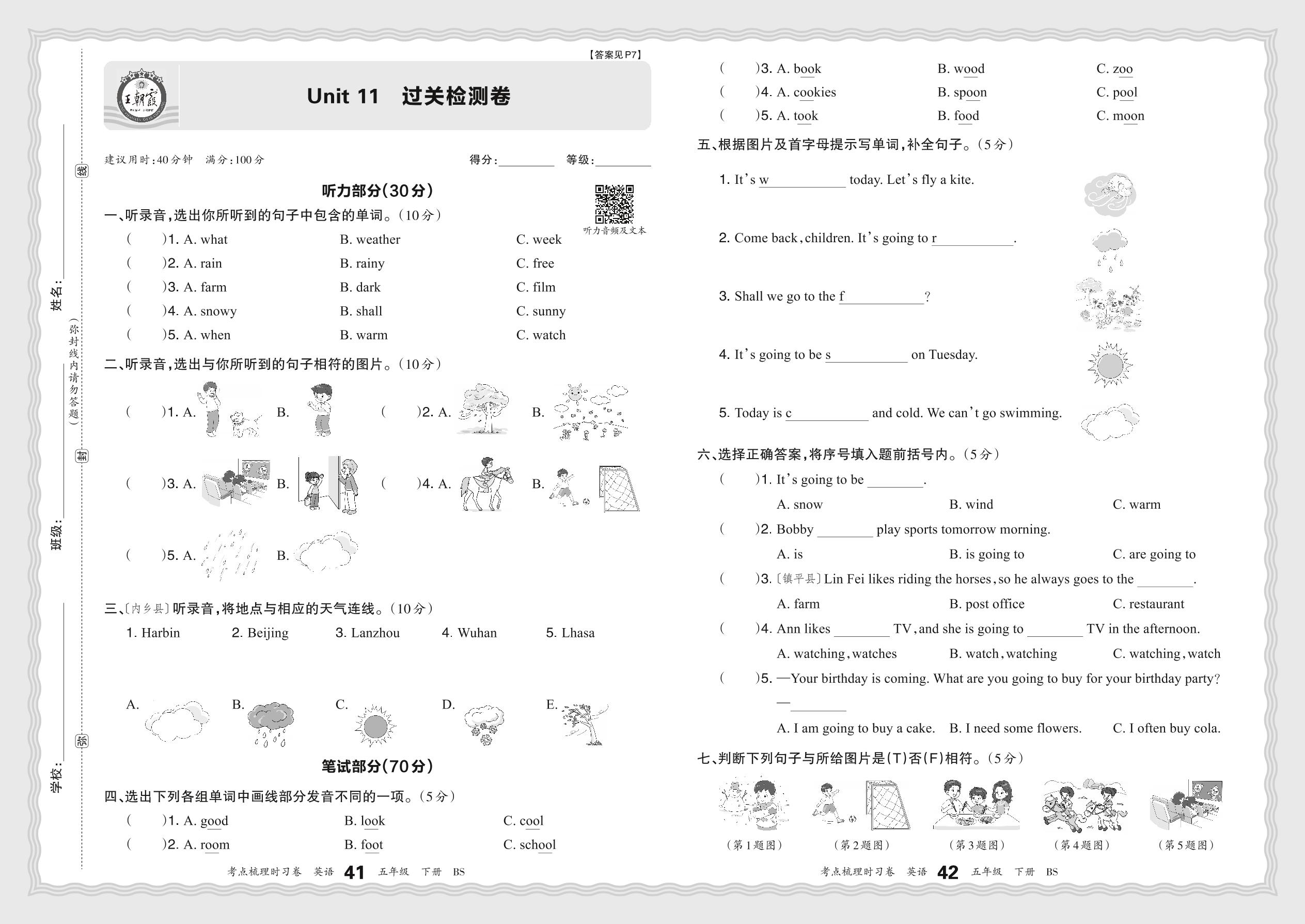 五年级英语北师版下册单元卷