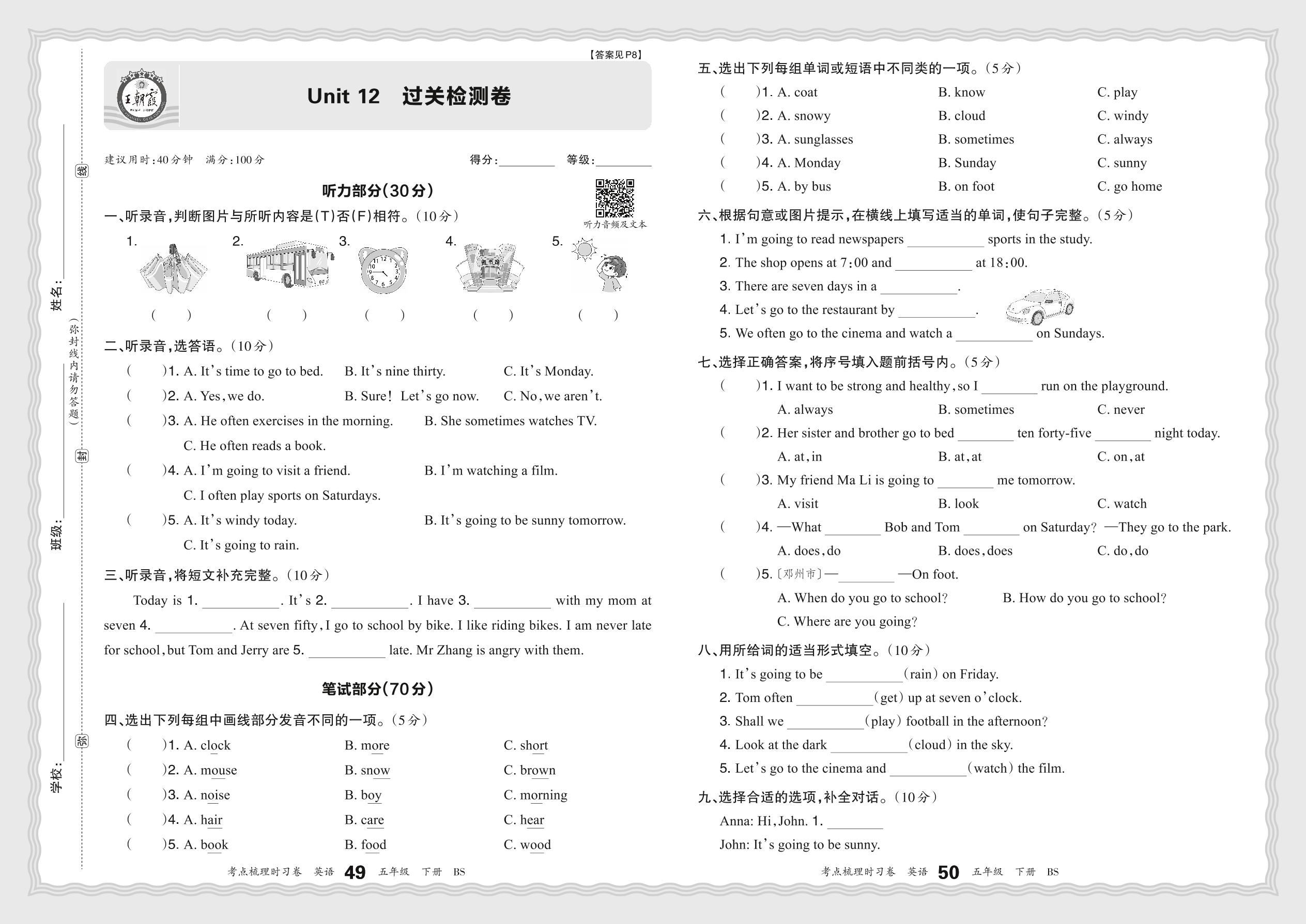 2024春下册五年级英语北师版 Unit 12 过关检测卷