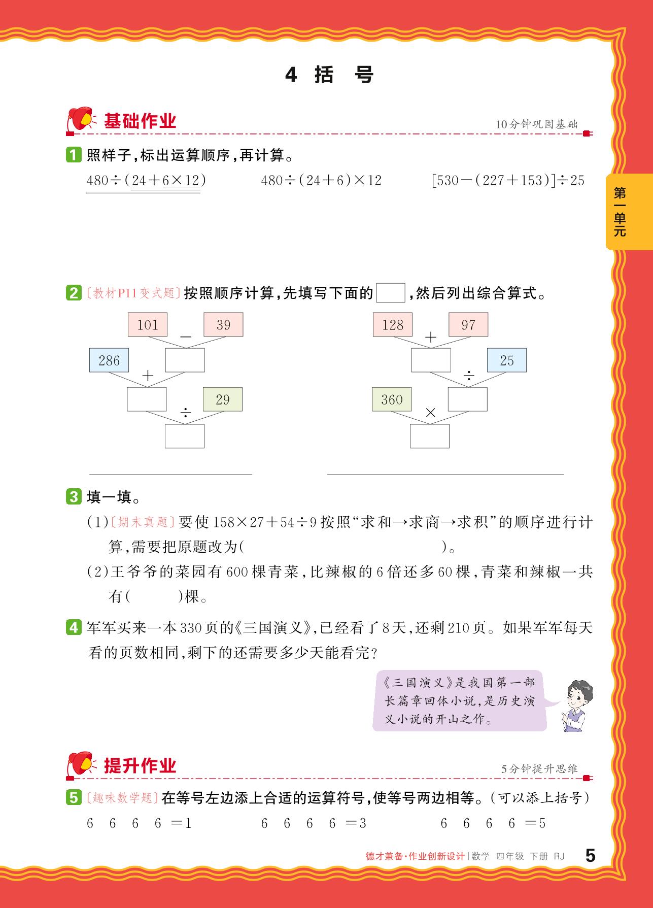 2024春下册四年级数学人教版 第一单元 四则运算——4. 括号