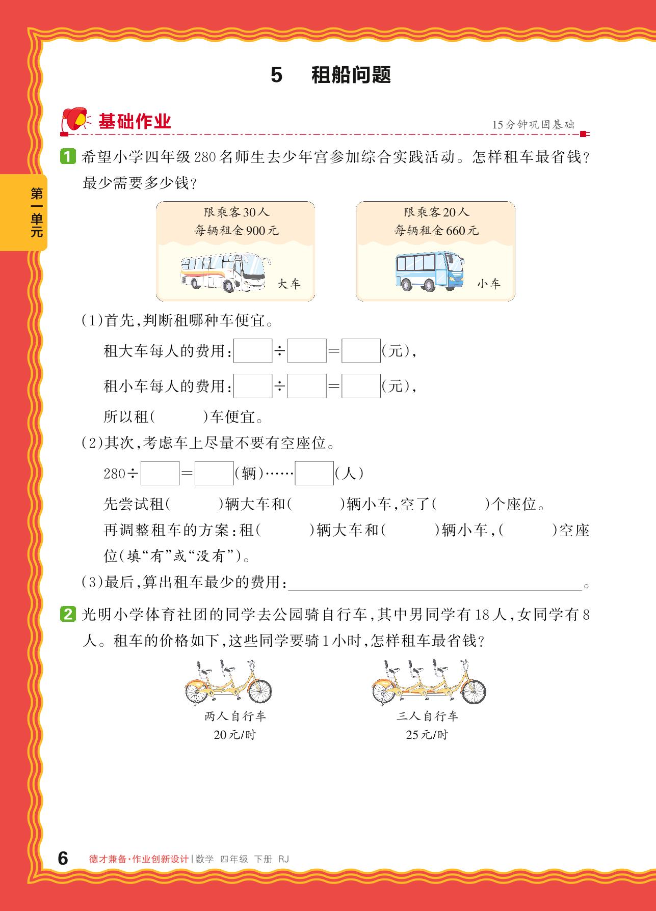 2024春下册四年级数学人教版 第一单元 四则运算——5. 租船问题
