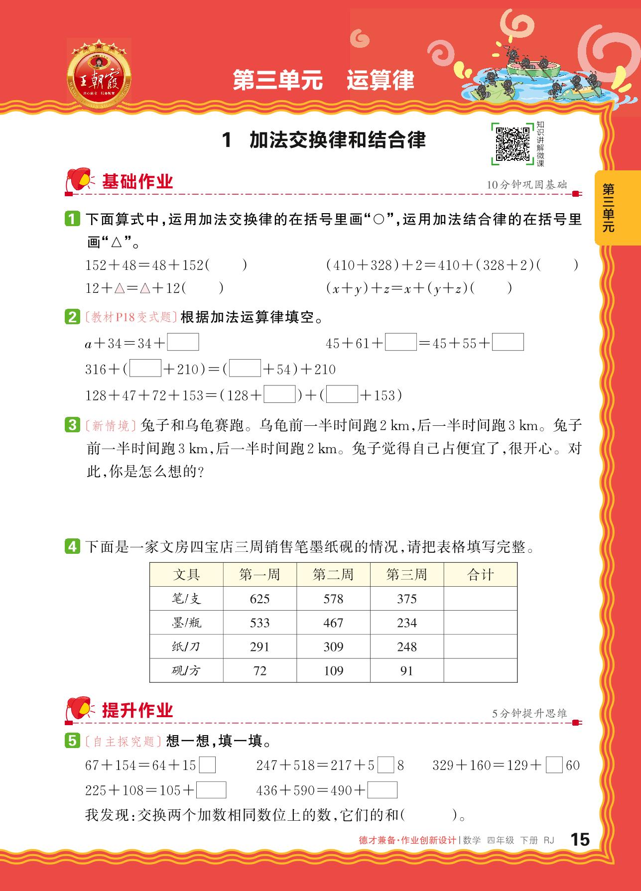 2024春下册四年级数学人教版 第三单元 运算律——1. 加法交换律和结合律