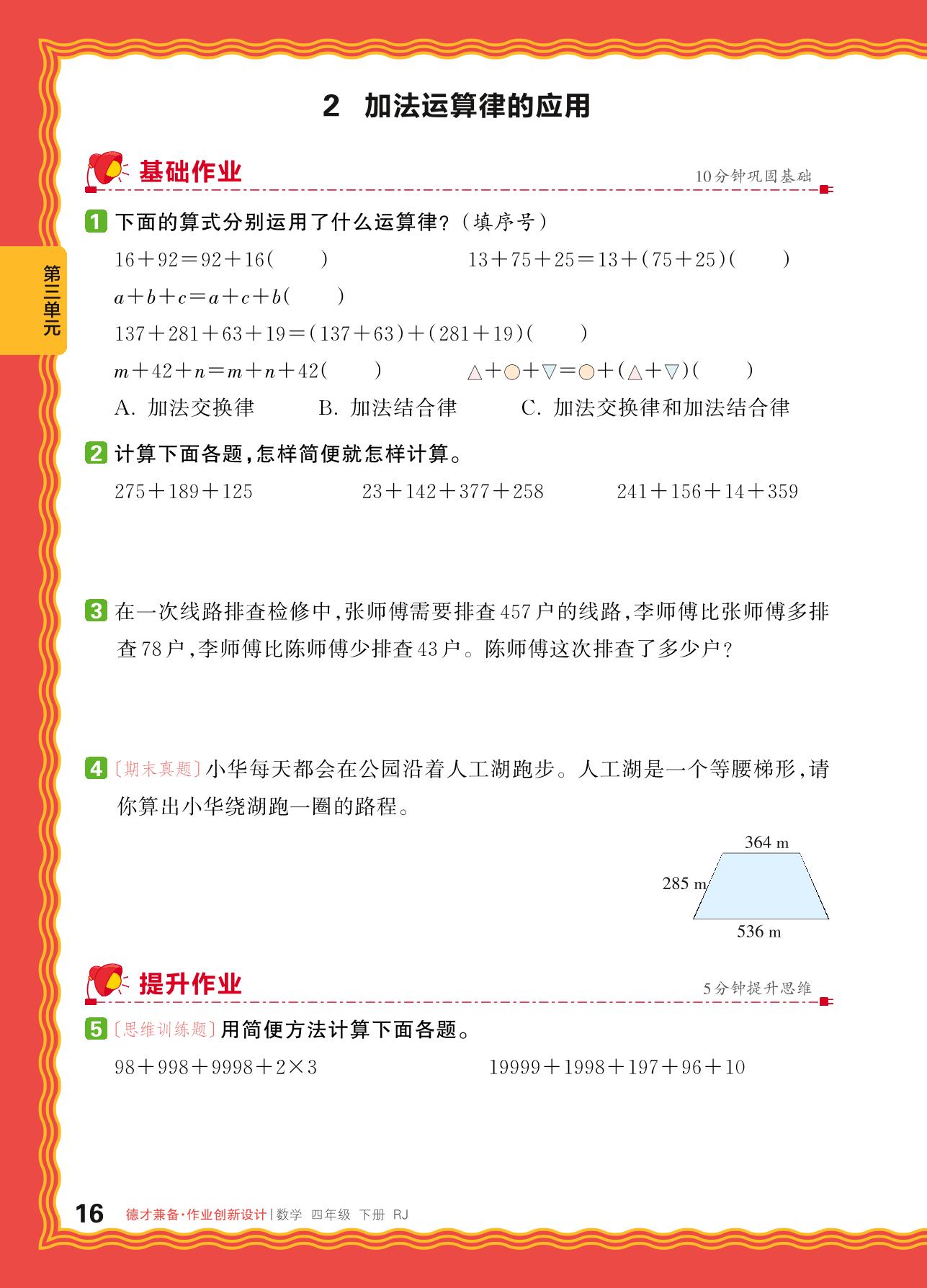 2024春下册四年级数学人教版 第三单元 运算律——2. 加法运算律的应用