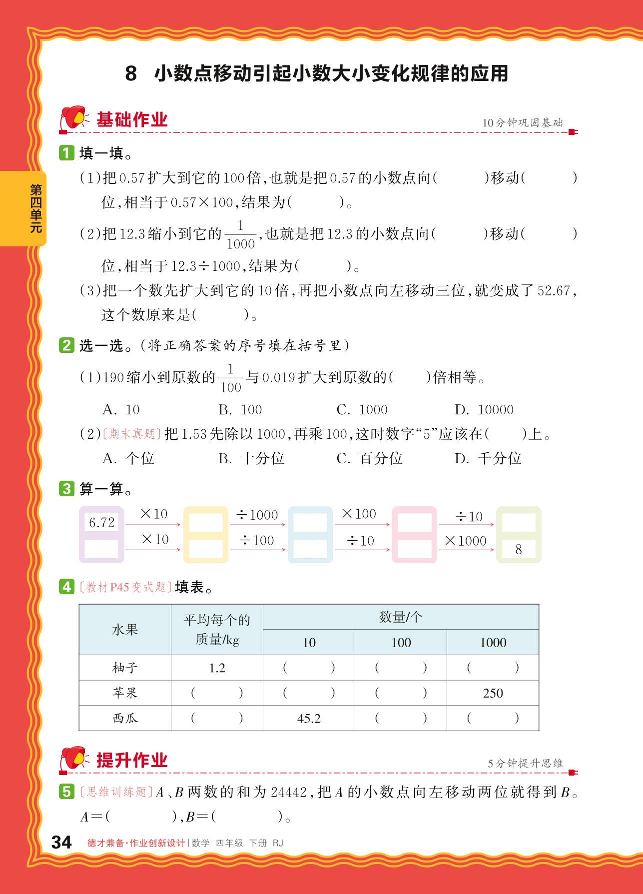 2024春下册四年级数学人教版 第四单元 小数的意义和性质——8. 小数点移动引起小数大小的变化规律应用