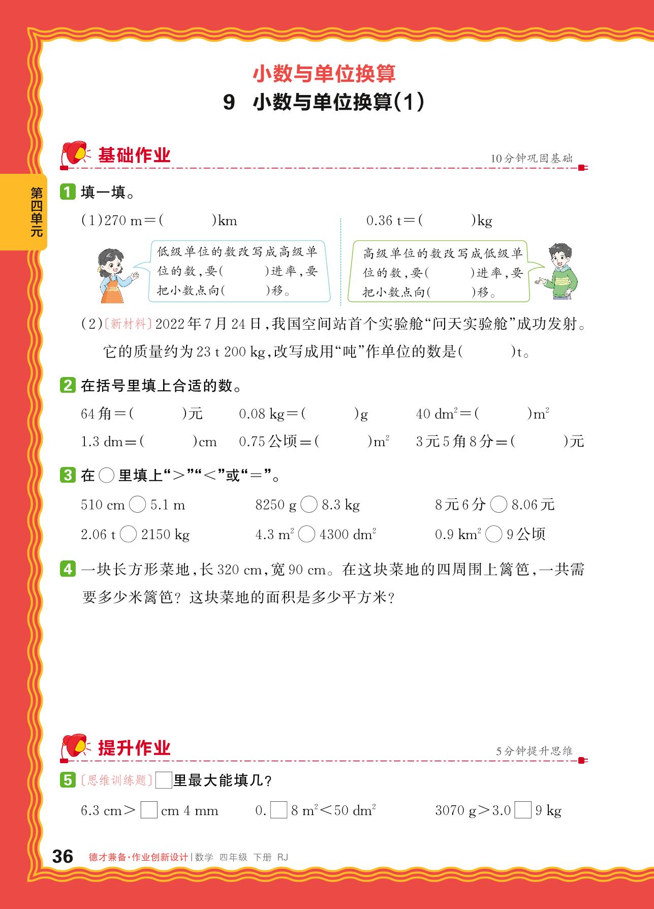 2024春下册四年级数学人教版 第四单元 小数的意义和性质——9. 小数与单位换算(1)