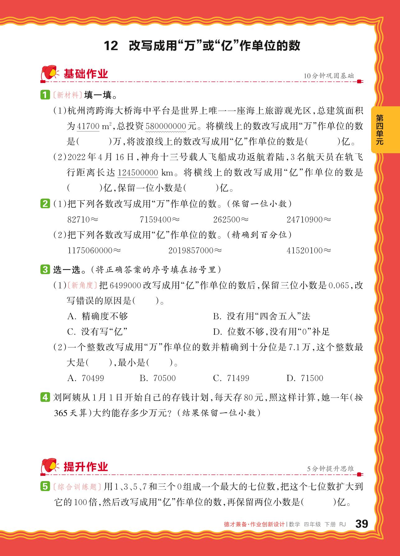 2024春下册四年级数学人教版 第四单元 小数的意义和性质——12. 改写成用“万”或“亿”作单位的数