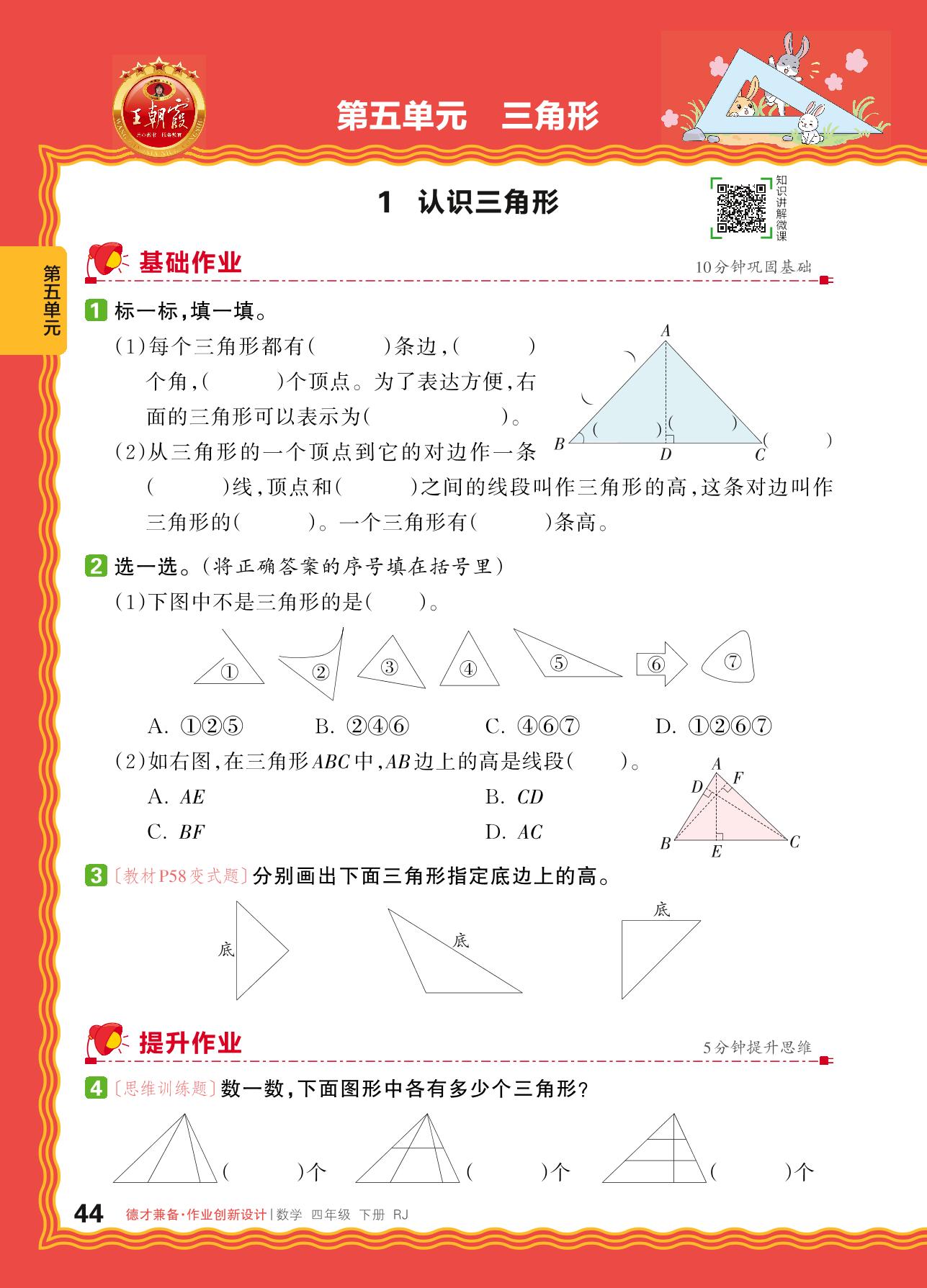 2024春下册四年级数学人教版 第五单元 三角形——1. 认识三角形