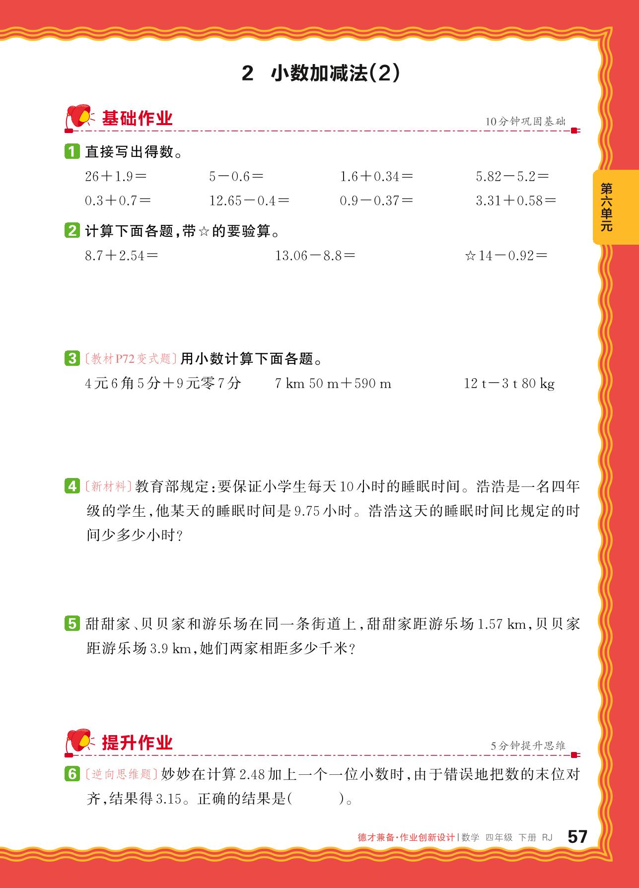 2024春下册四年级数学人教版 第六单元 小数的加法和减法——2. 小数加减法(2)