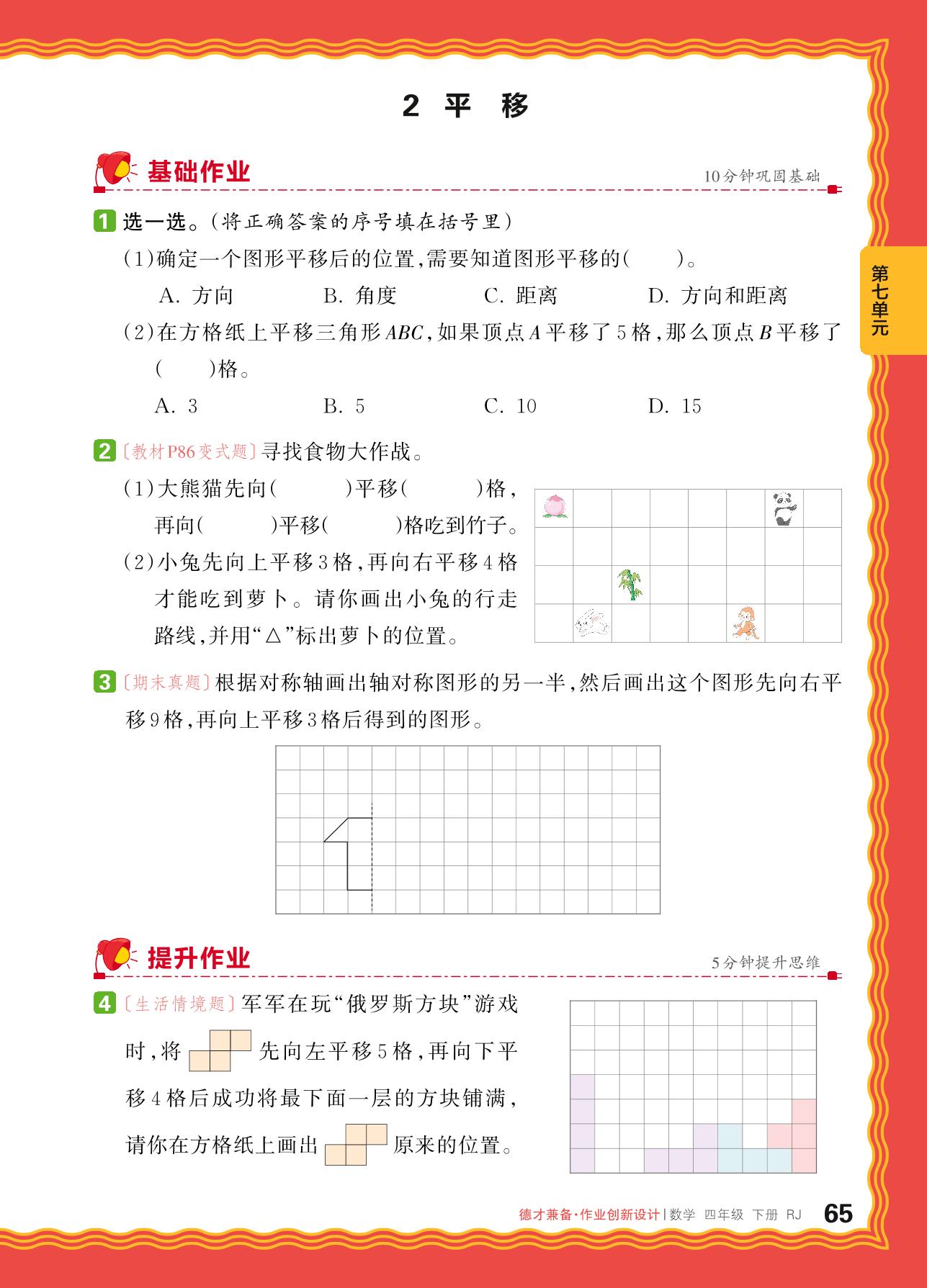 2024春下册四年级数学人教版 第七单元 图形的运动(二)——2. 平移