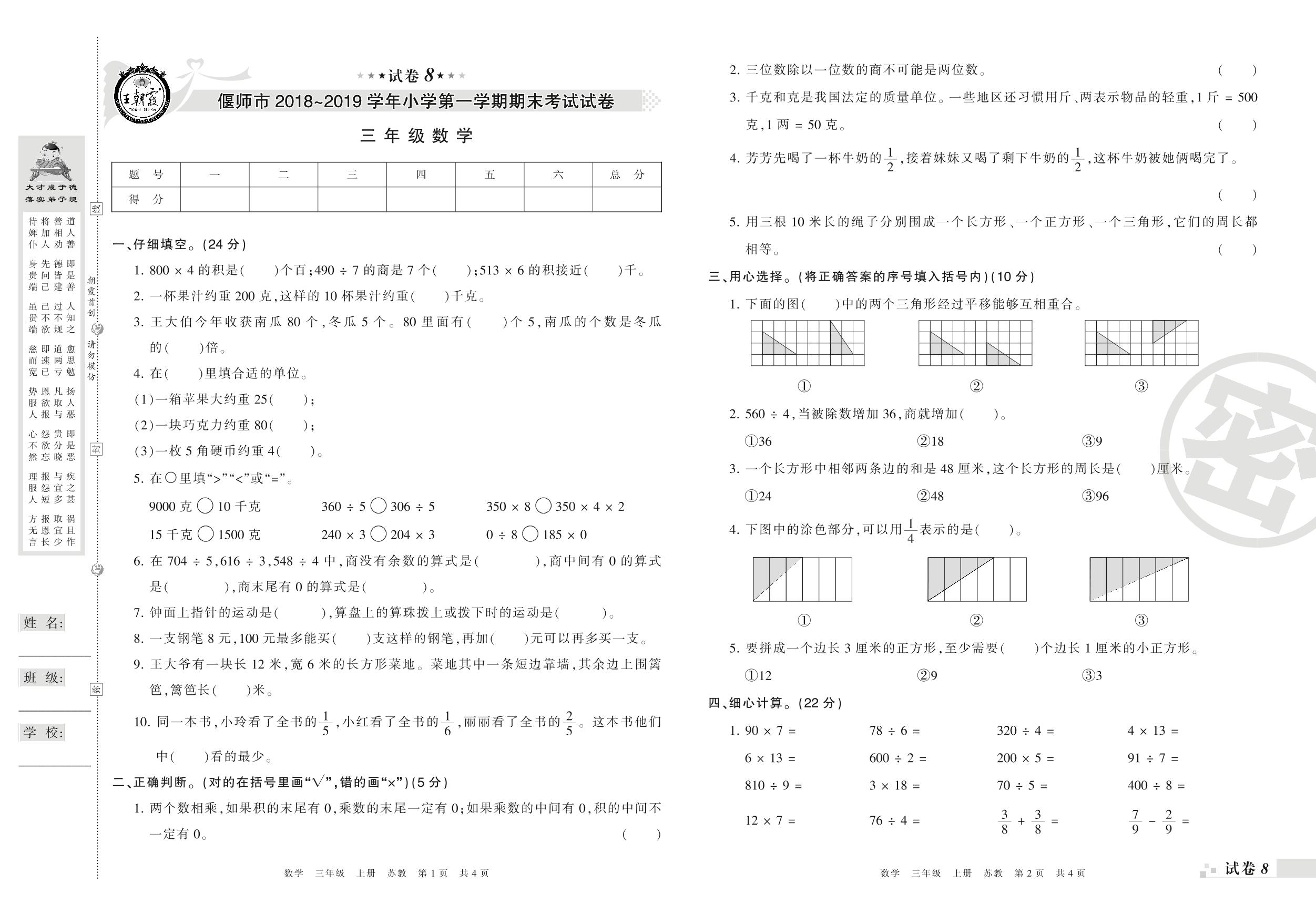 2018-2019学年第一学期偃师市三年级数学试卷(苏教版)【8】