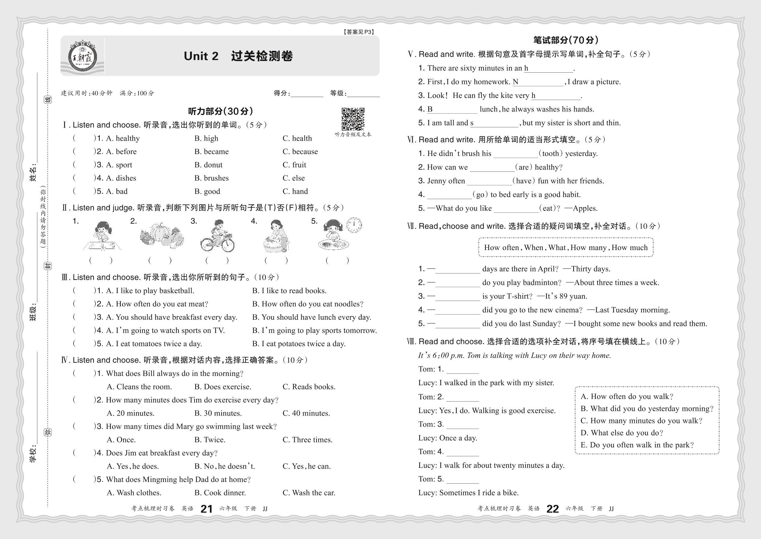 2024春下册六年级英语冀教版 Unit 2 过关检测卷