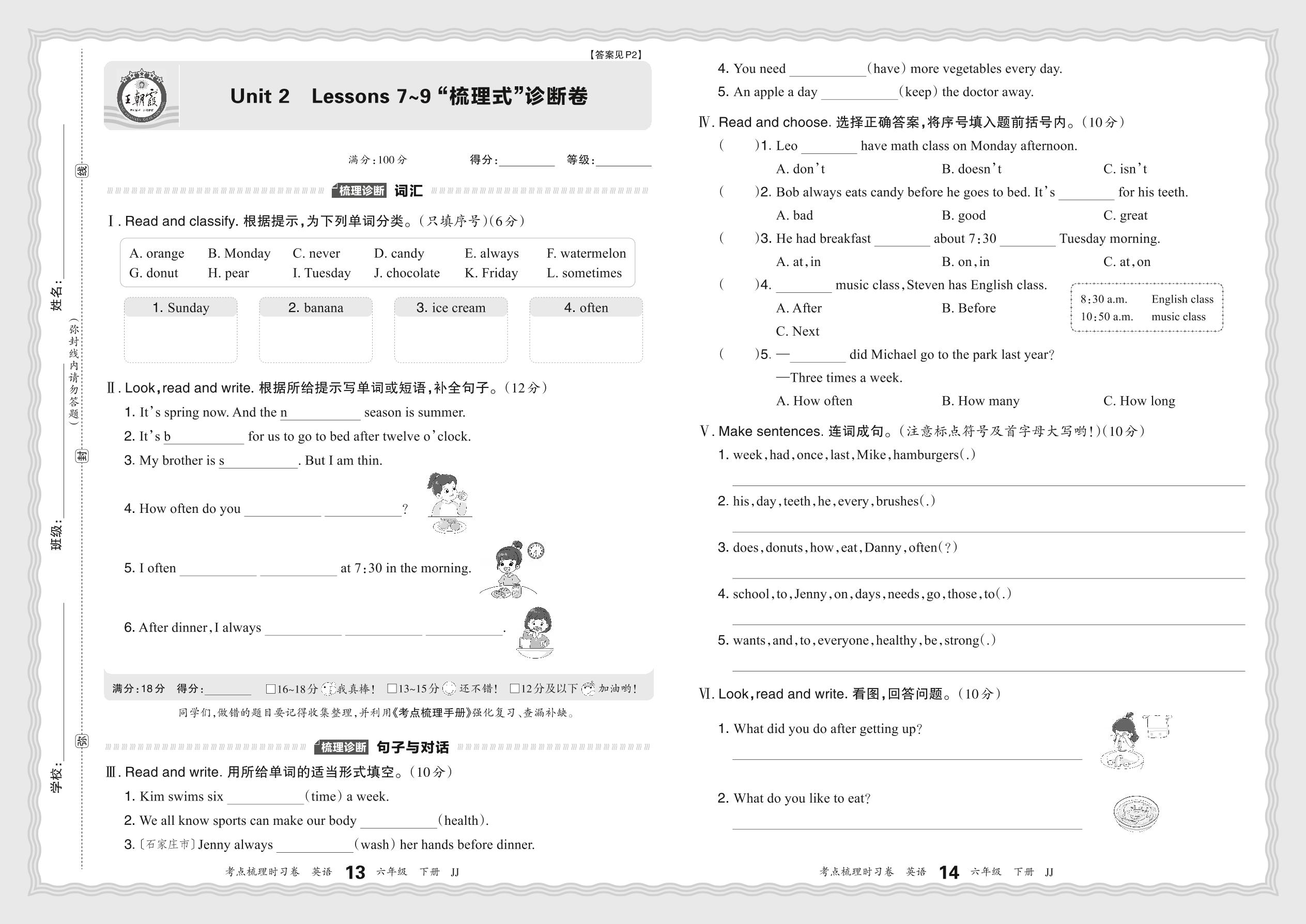 2024春下册六年级英语冀教版 Unit 2 Lessons 7~9 “梳理式”诊断卷