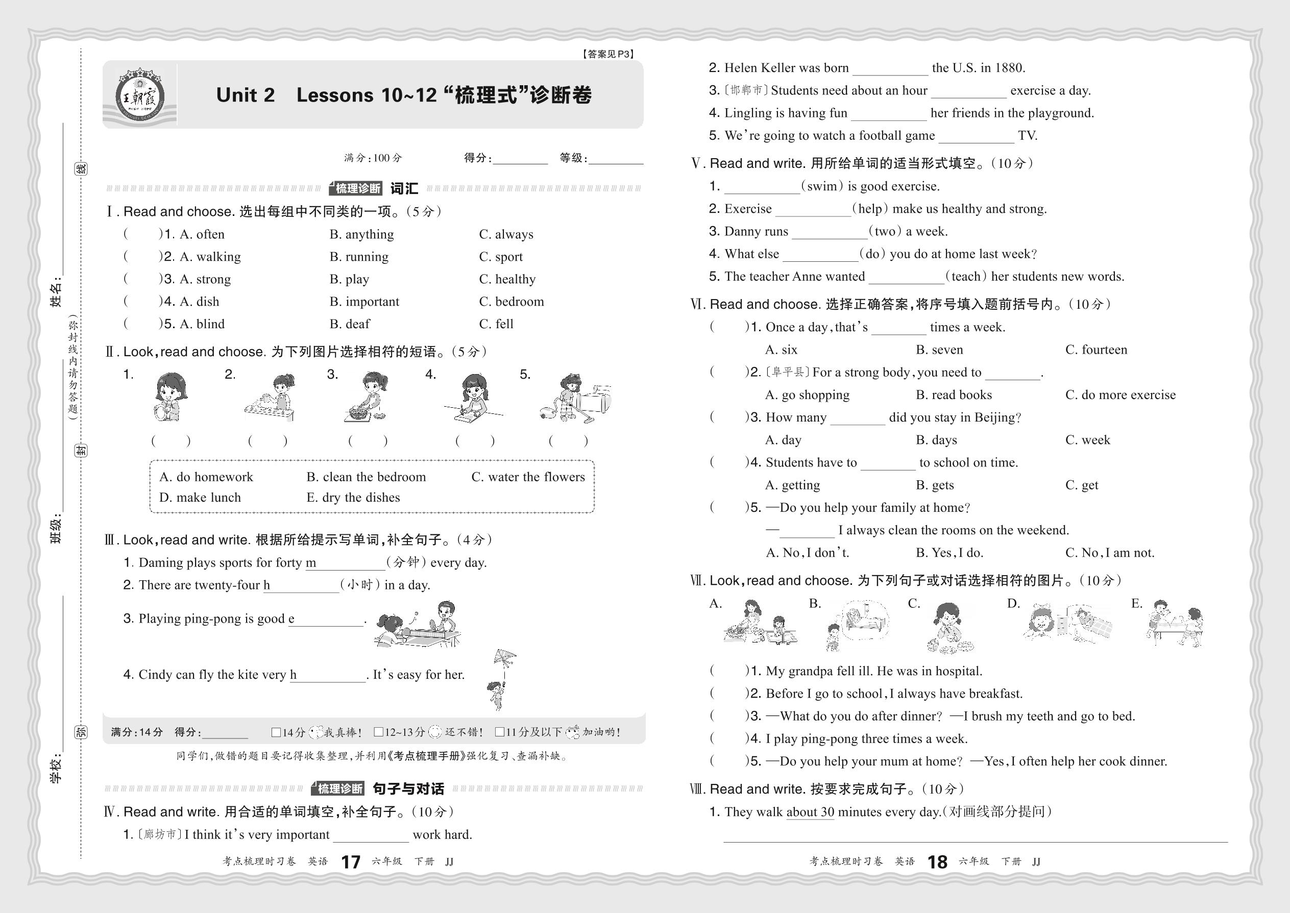 2024春下册六年级英语冀教版 Unit 2 Lessons 10~12 “梳理式”诊断卷