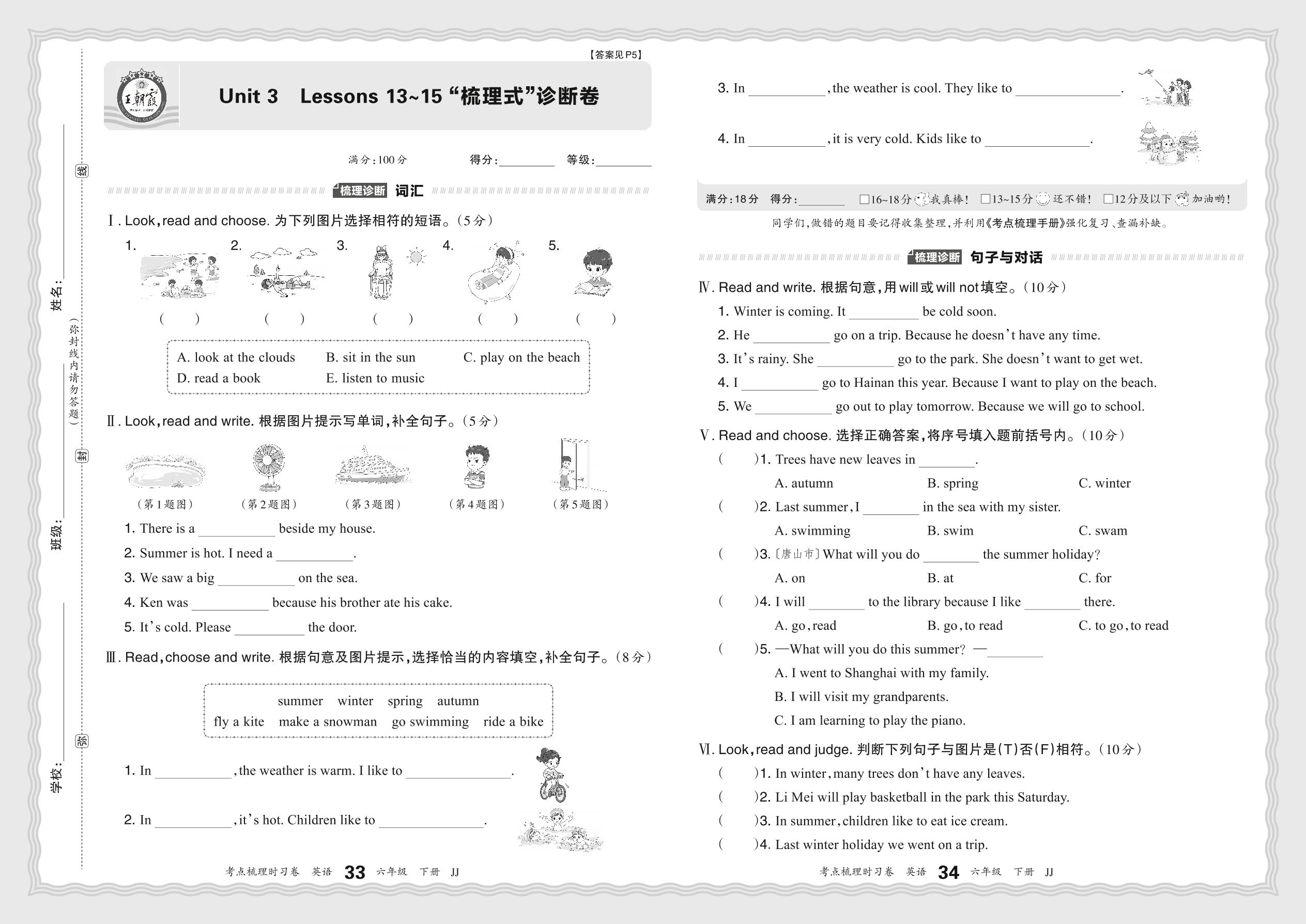 2024春下册六年级英语冀教版 Unit 3 Lessons 13~15 “梳理式”诊断卷