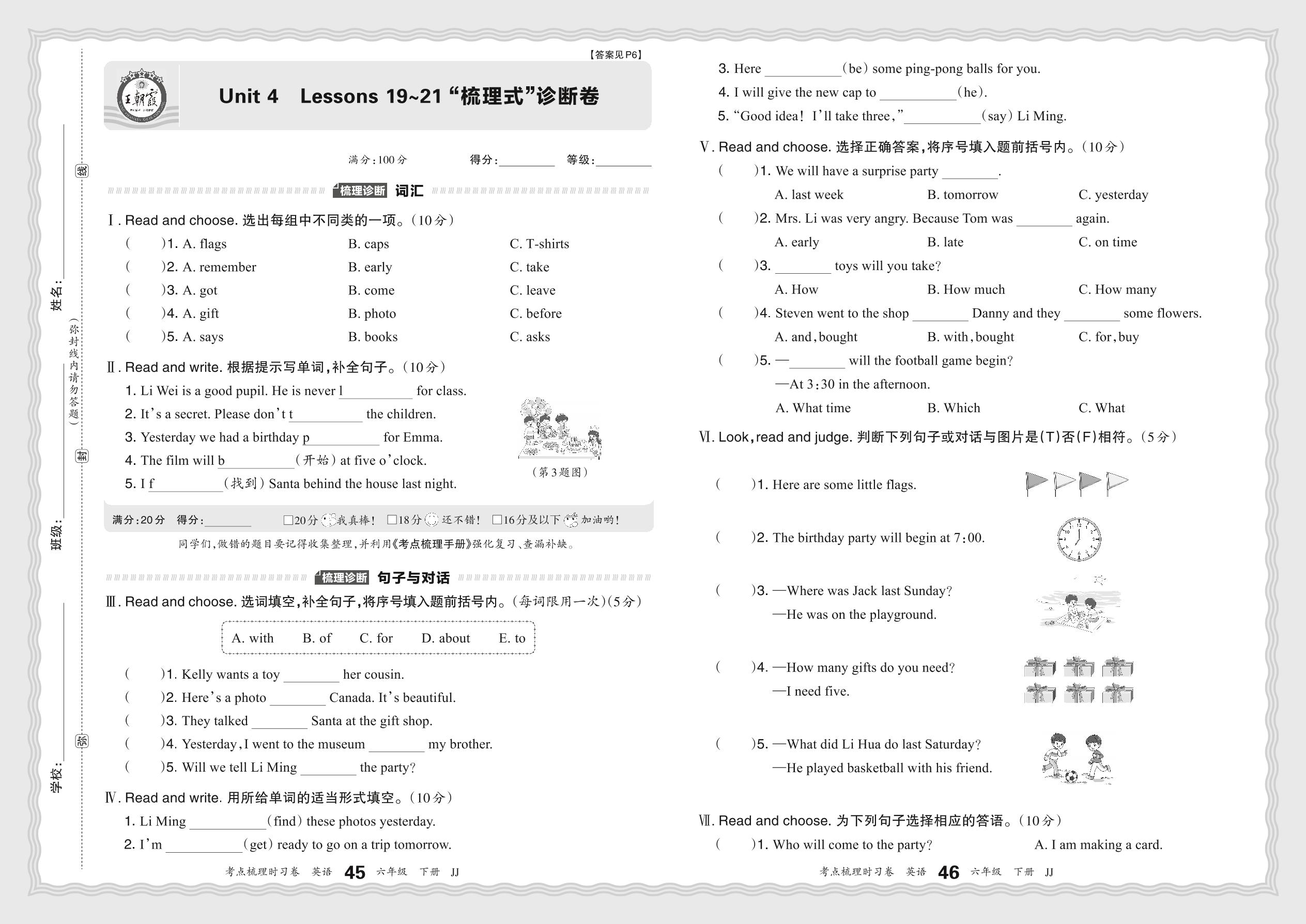 2024春下册六年级英语冀教版 Unit 4 Lessons 19~21 “梳理式”诊断卷