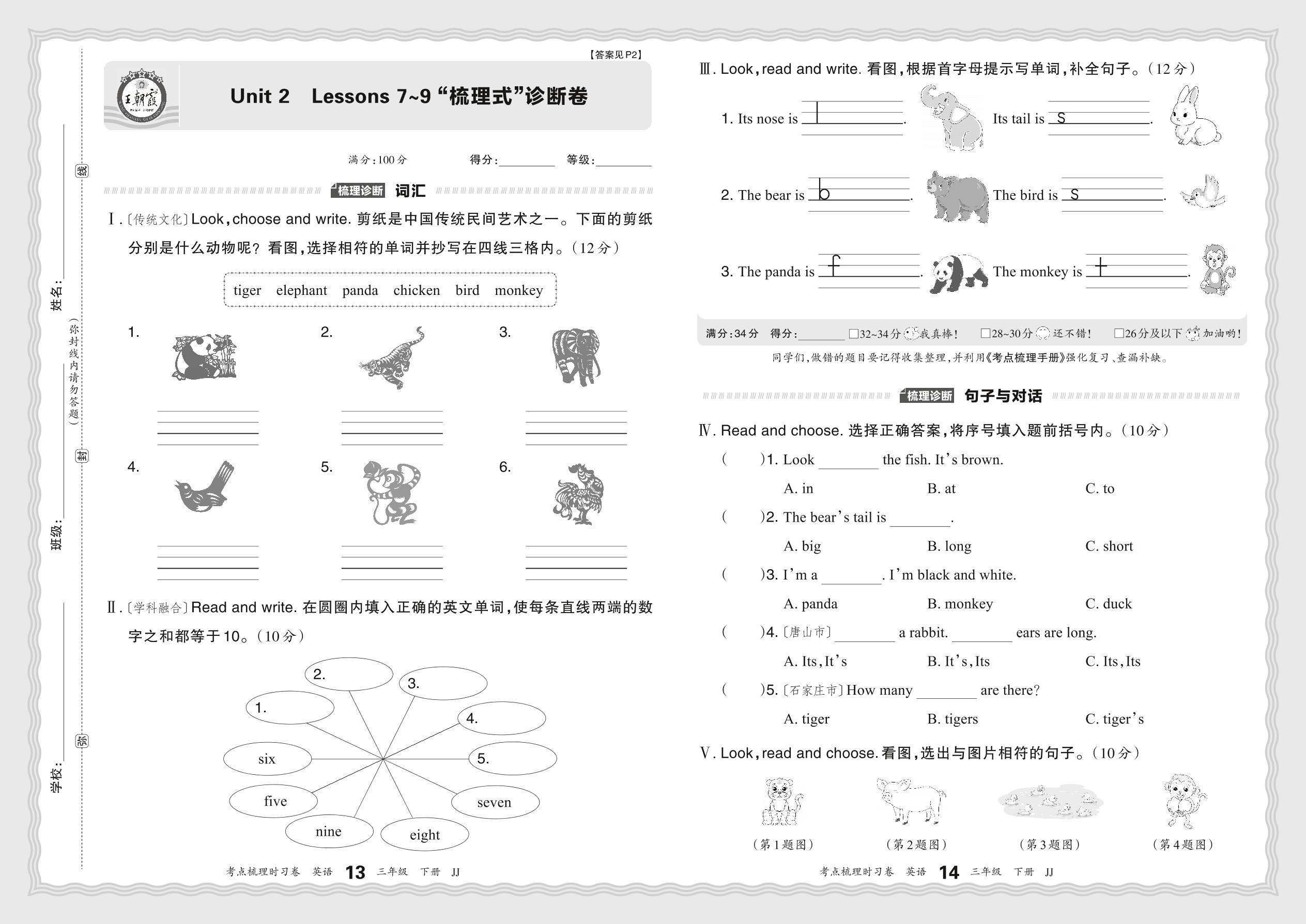 2024春下册三年级英语冀教版 Unit 2 Lessons 7~9 “梳理式”诊断卷