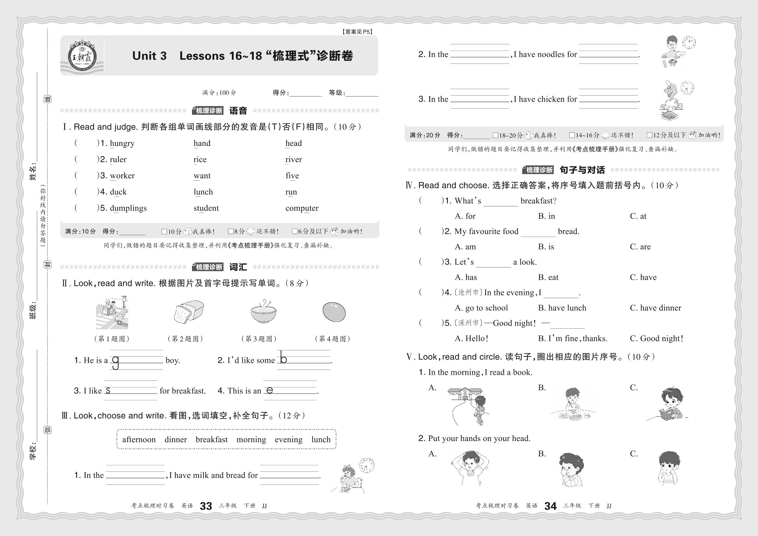 2024春下册三年级英语冀教版 Unit 3 Lessons 16~18 “梳理式”诊断卷