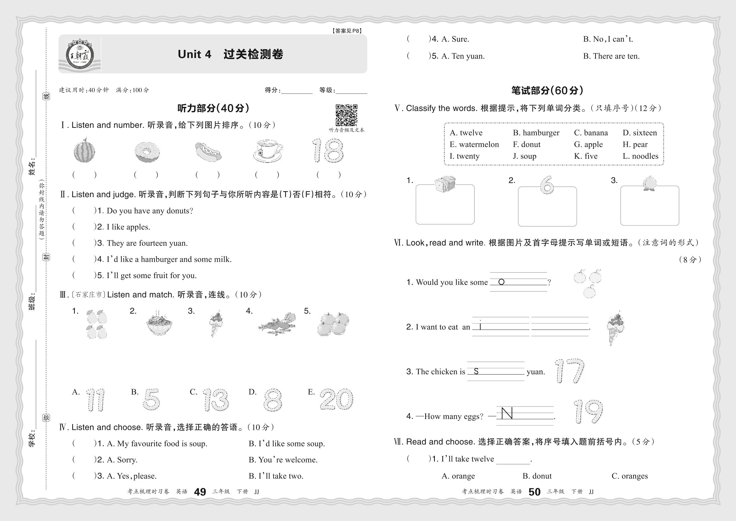 2024春下册三年级英语冀教版 Unit 4 过关检测卷
