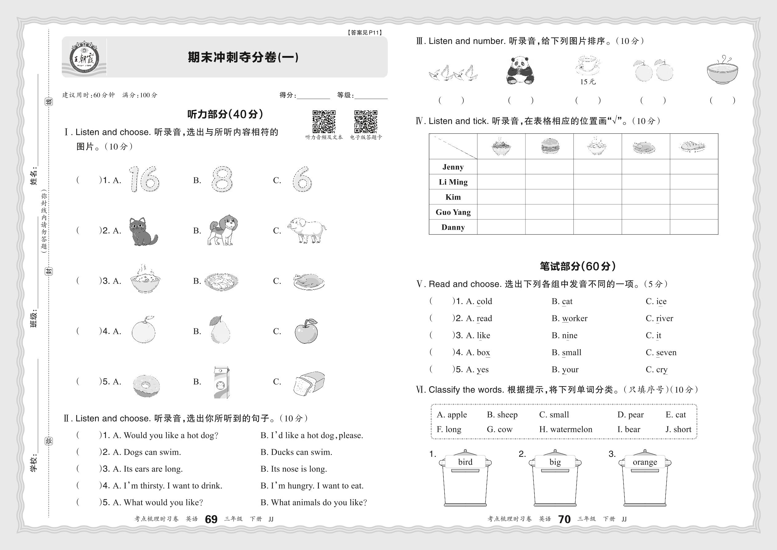 2024春下册三年级英语冀教版 期末冲刺夺分卷(一)