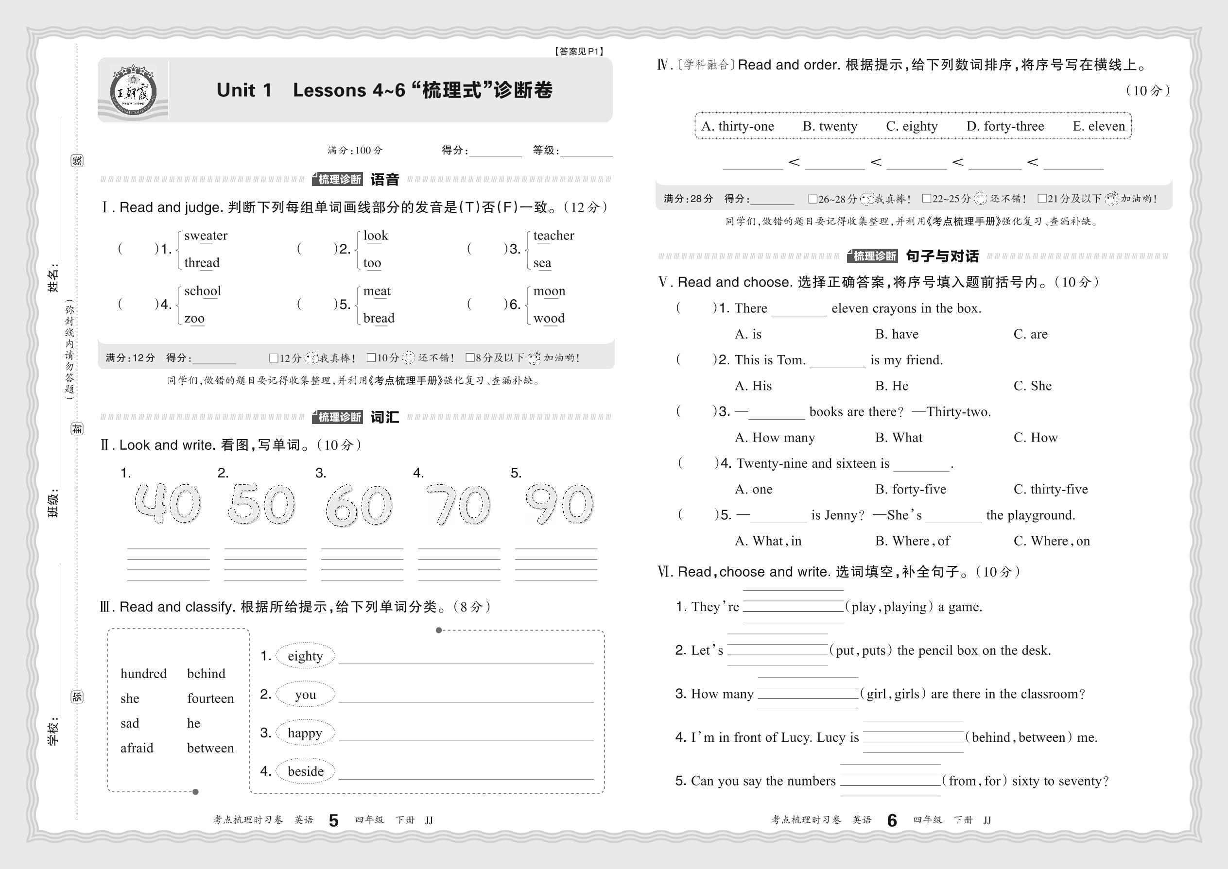 2024春下册四年级英语冀教版 Unit 1 Lessons 4~6 “梳理式”诊断卷