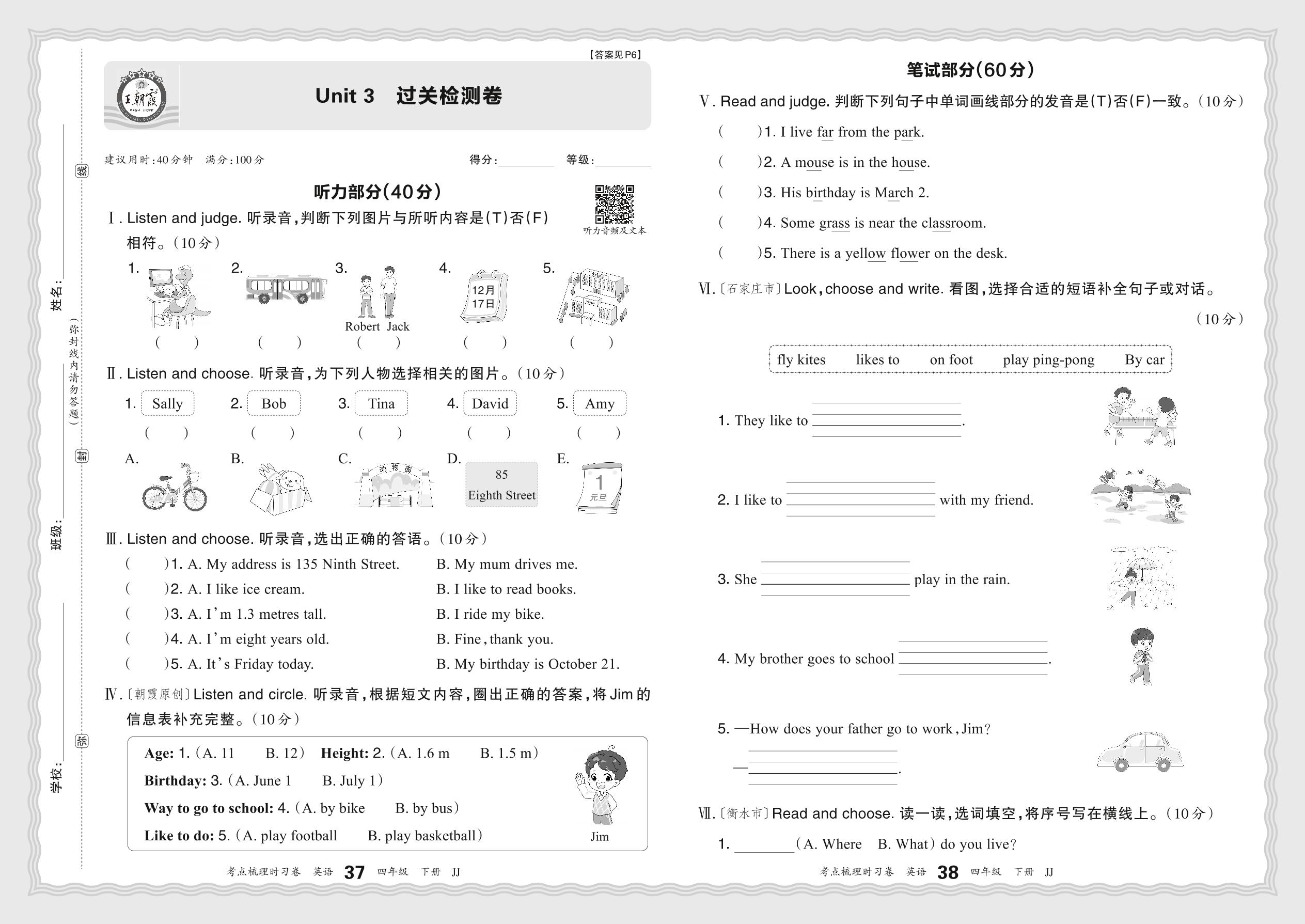2024春下册四年级英语冀教版 Unit 3 过关检测卷