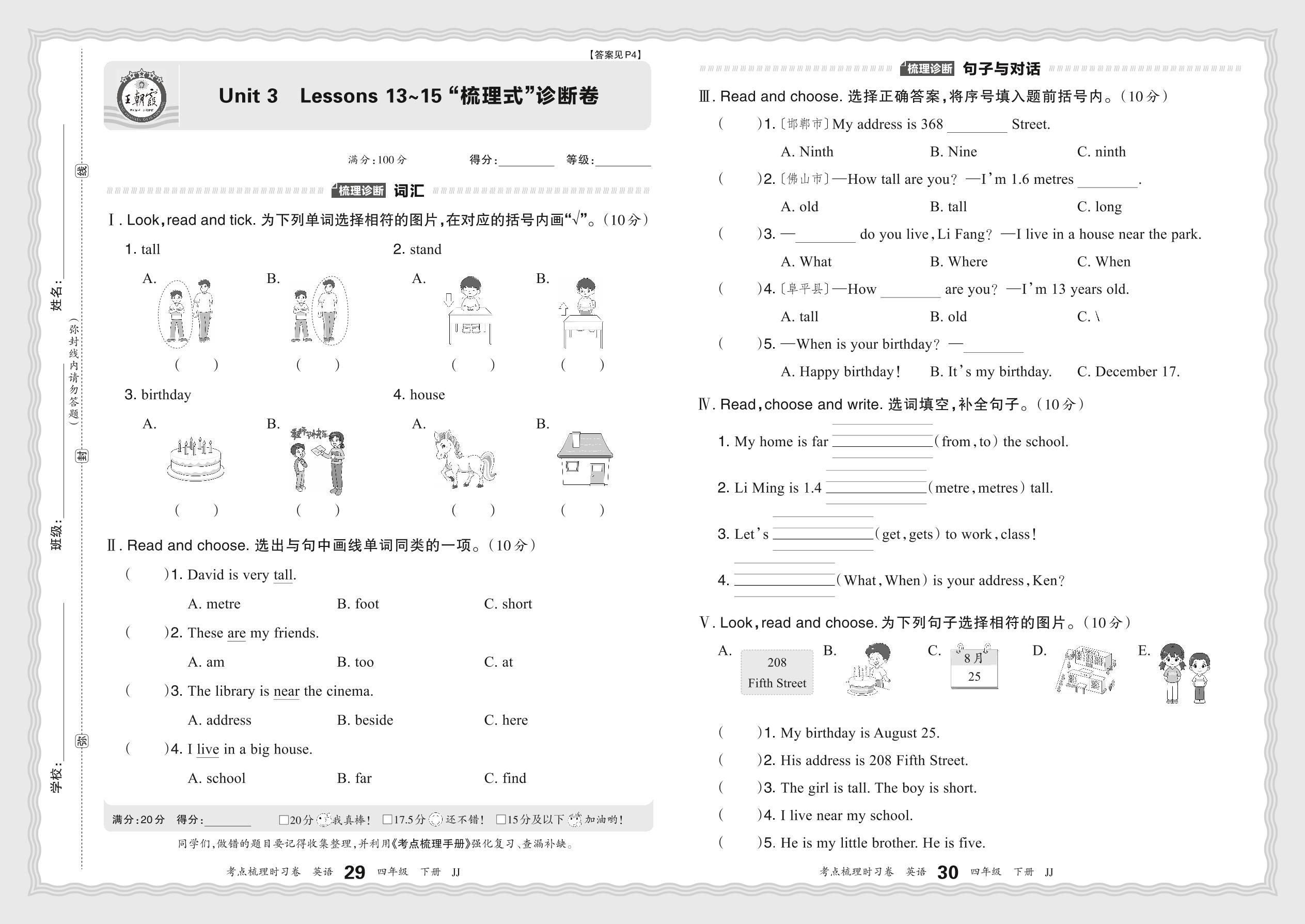 2024春下册四年级英语冀教版 Unit 3 Lessons 13~15 “梳理式”诊断卷