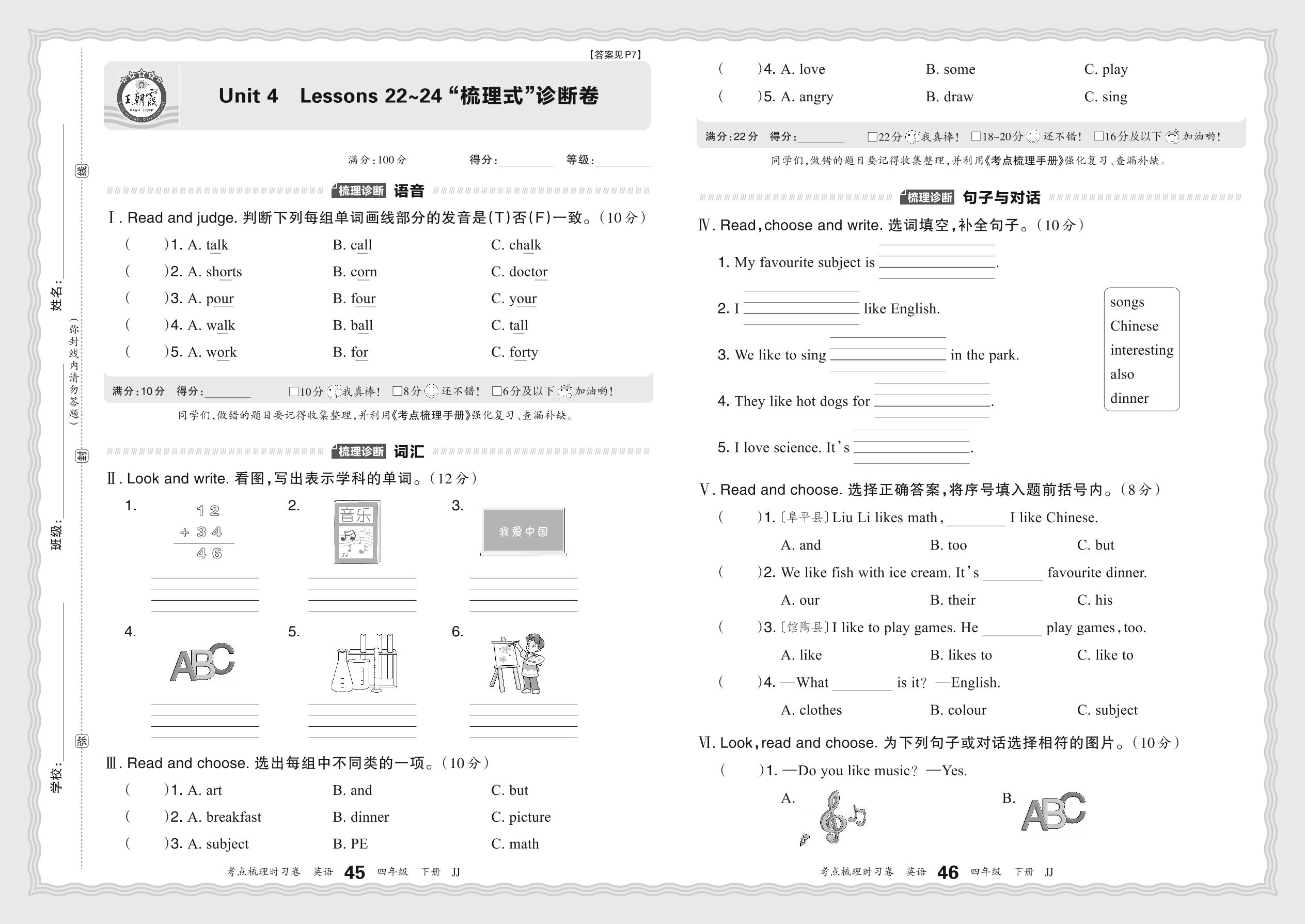 2024春下册四年级英语冀教版 Unit 4 Lessons 22~24 “梳理式”诊断卷