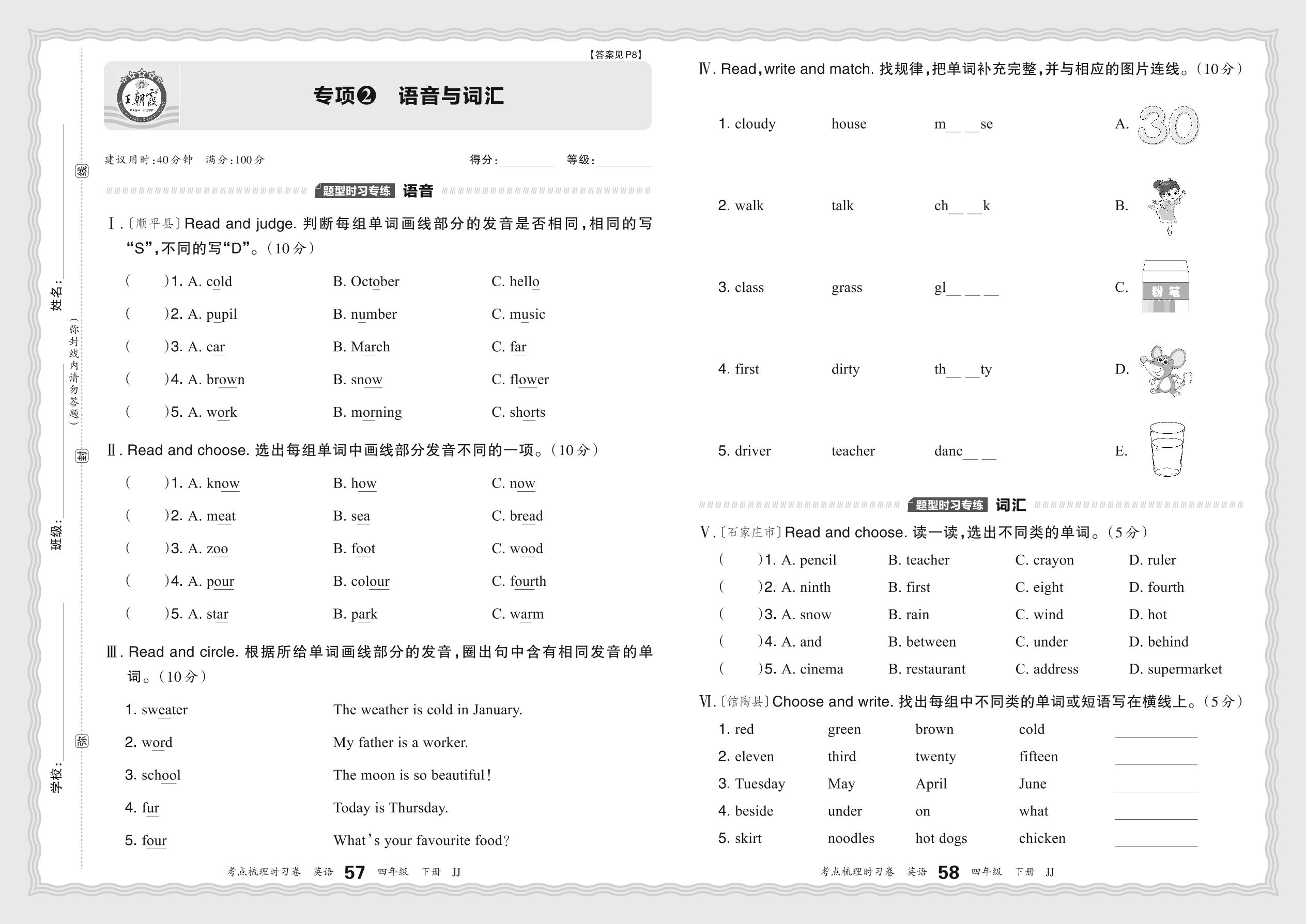 2024春下册四年级英语冀教版 期末专项卷KD版·语音与词汇【2】