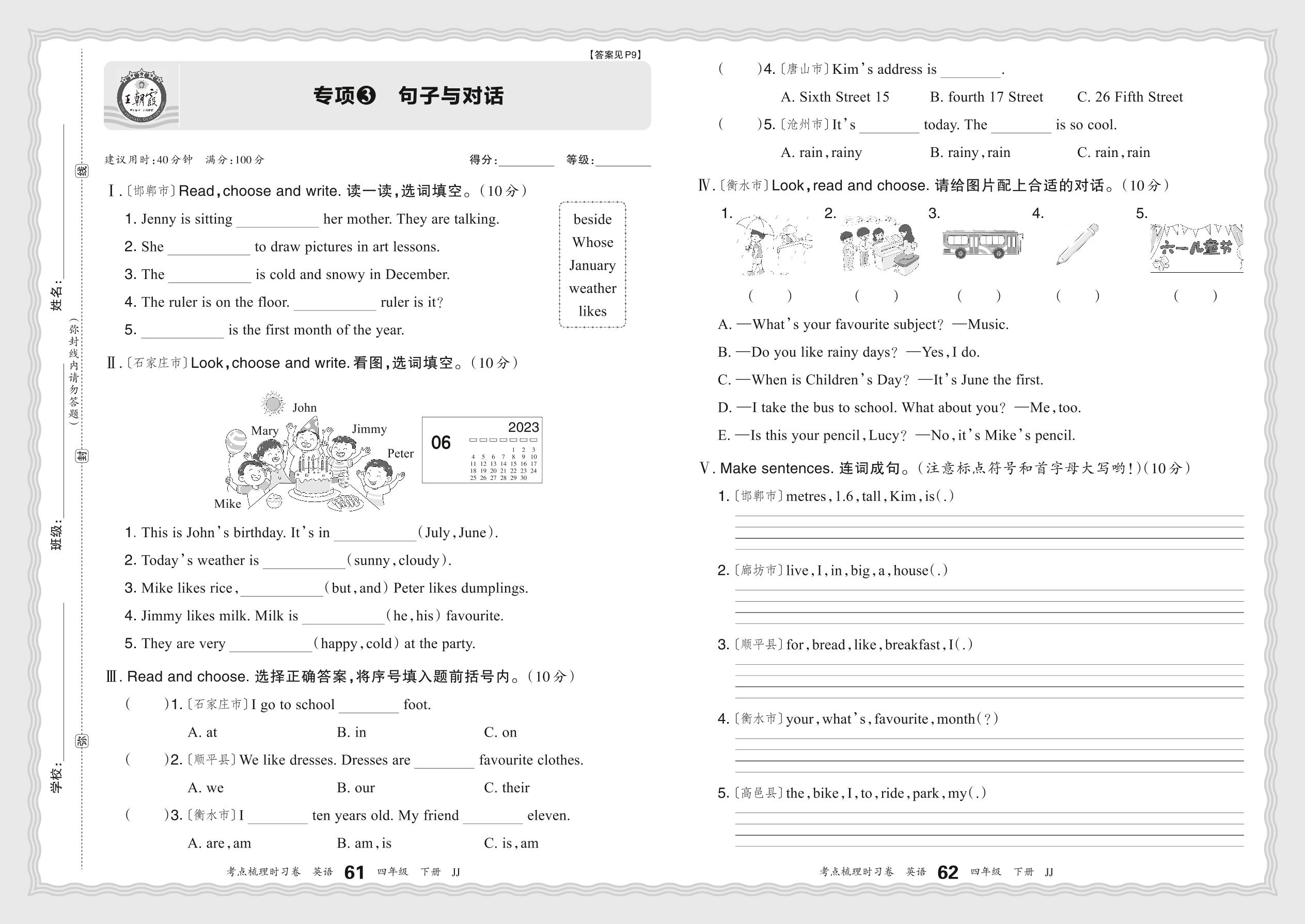 2024春下册四年级英语冀教版 期末专项卷KD版·句子与对话【3】