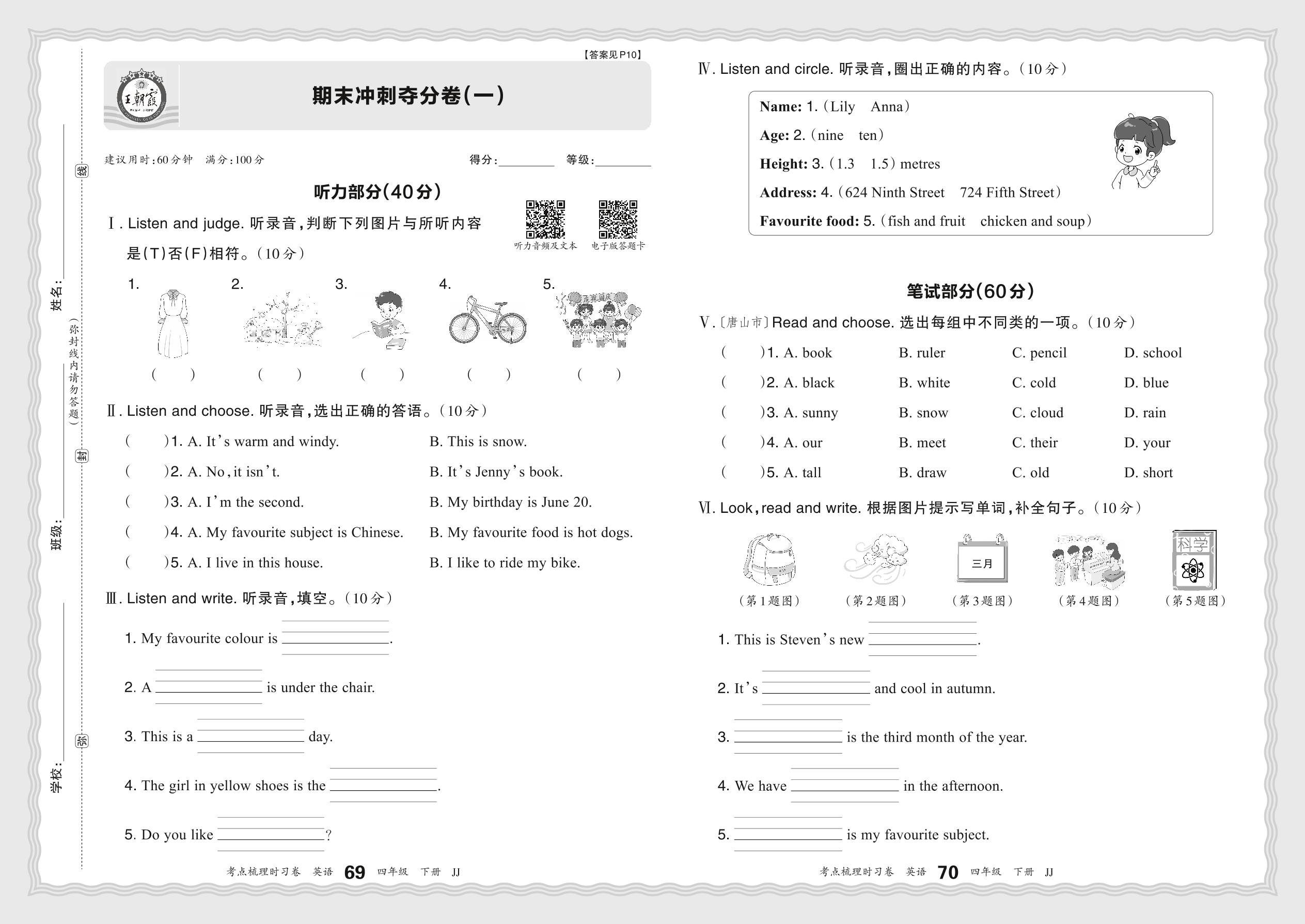 2024春下册四年级英语冀教版 期末冲刺夺分卷(一)