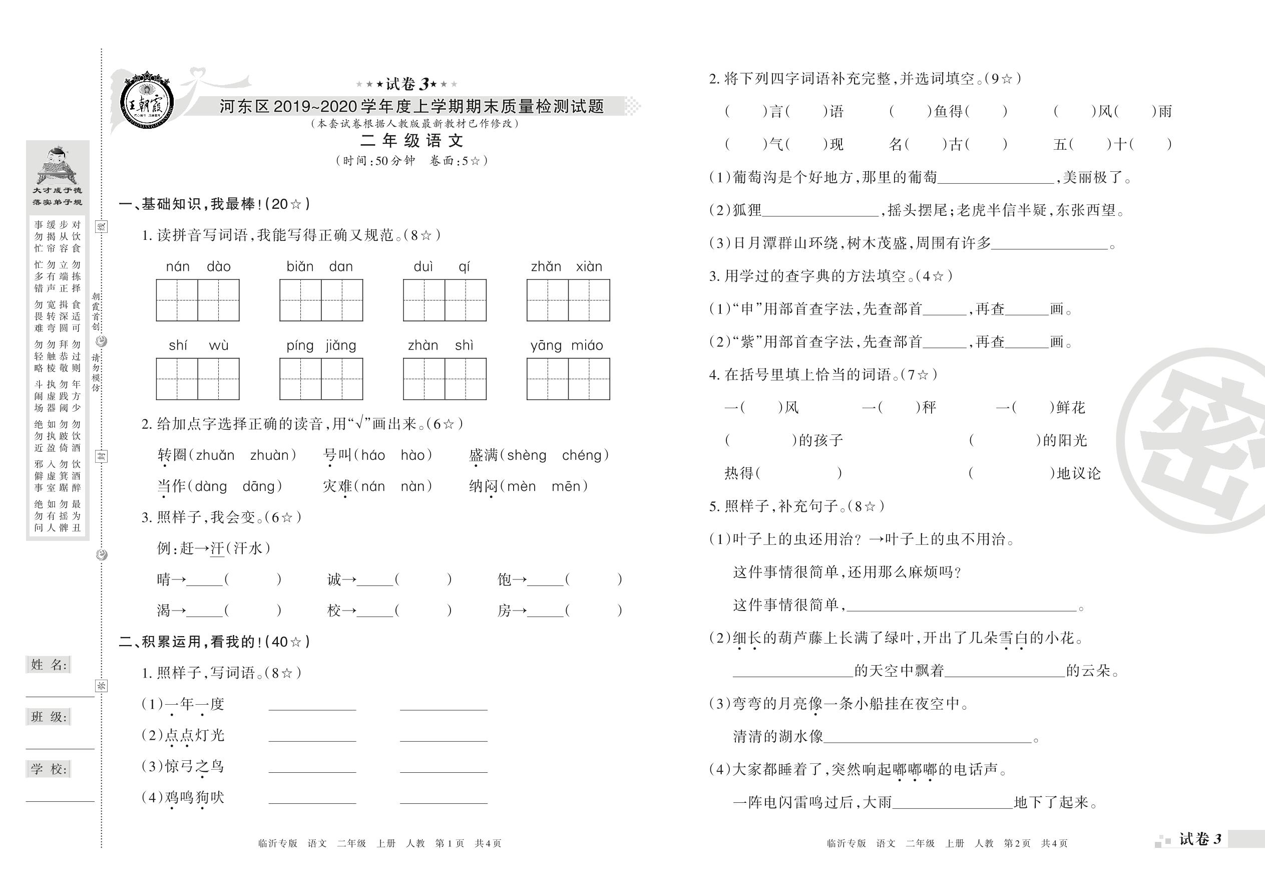 2019-2020学年第一学期临沂市河东区二年级语文试卷(人教版)【3】