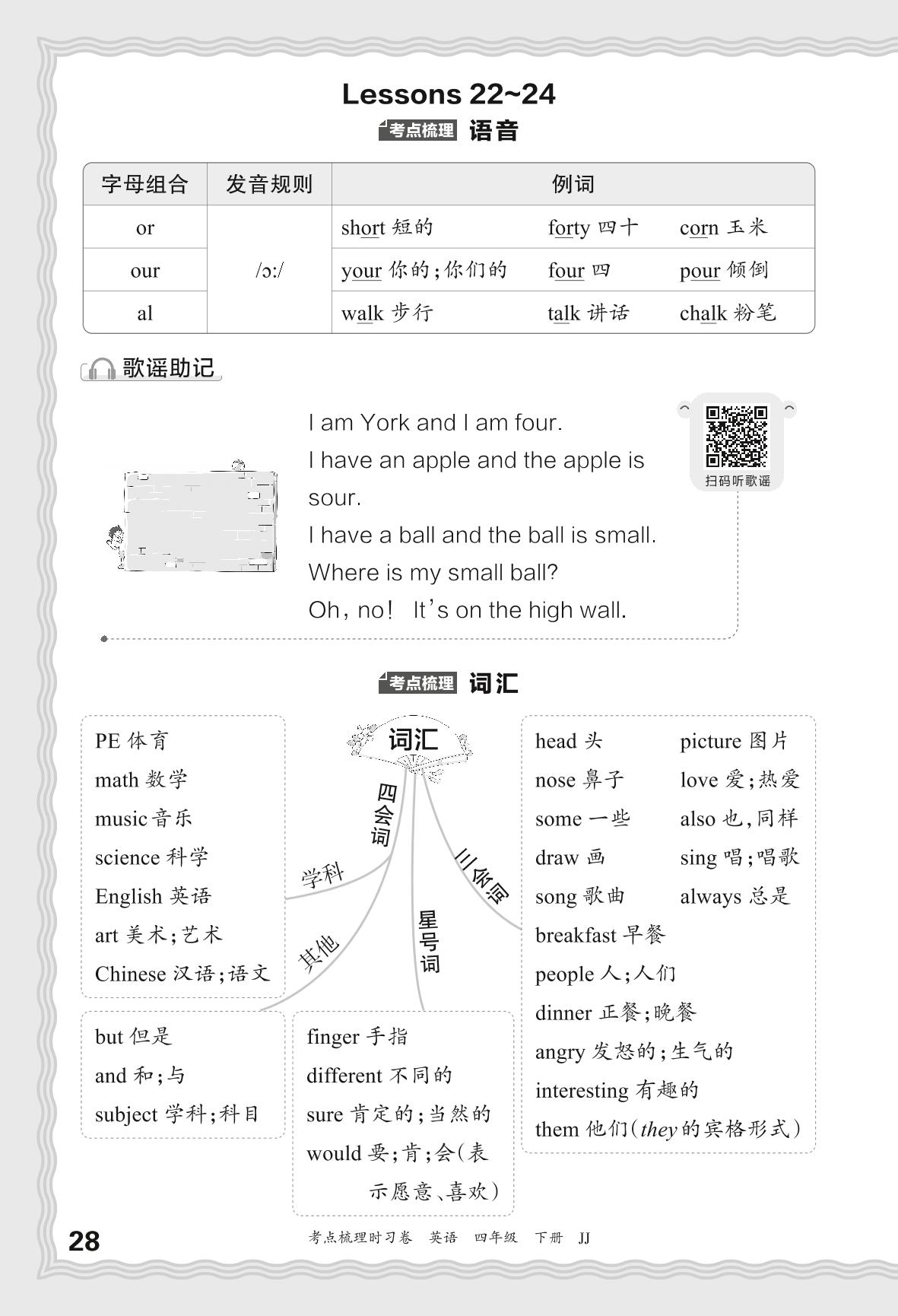 2024春下册四年级英语冀教版 考点梳理手册——Unit 4 Lessons 22~24