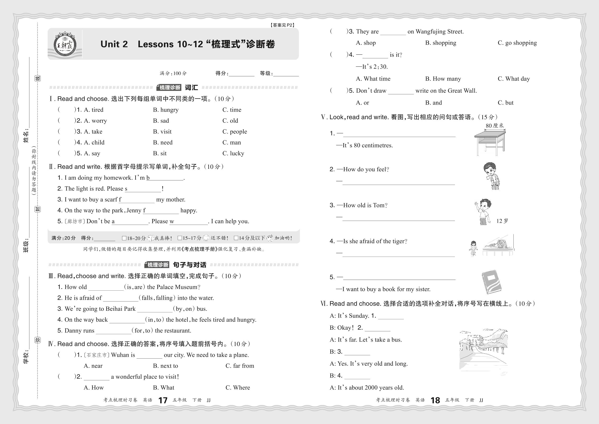2024春下册五年级英语冀教版 Unit 2 Lessons 10~12 “梳理式”诊断卷