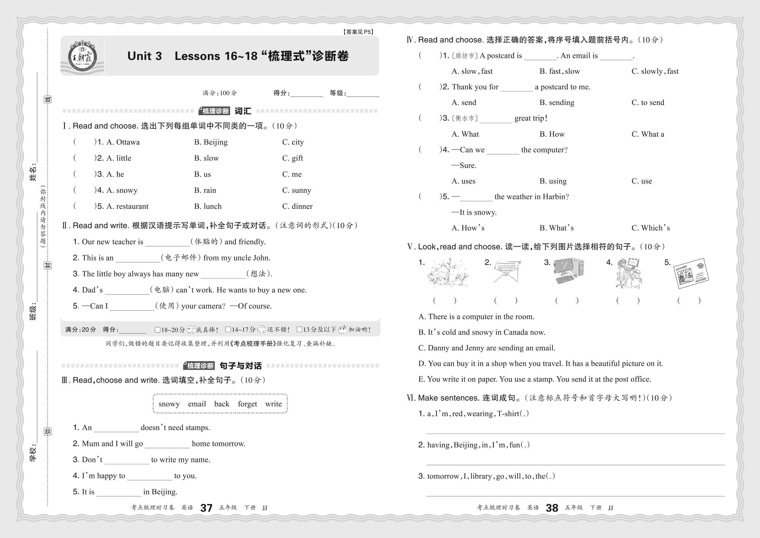2024春下册五年级英语冀教版 Unit 3 Lessons 16~18 “梳理式”诊断卷