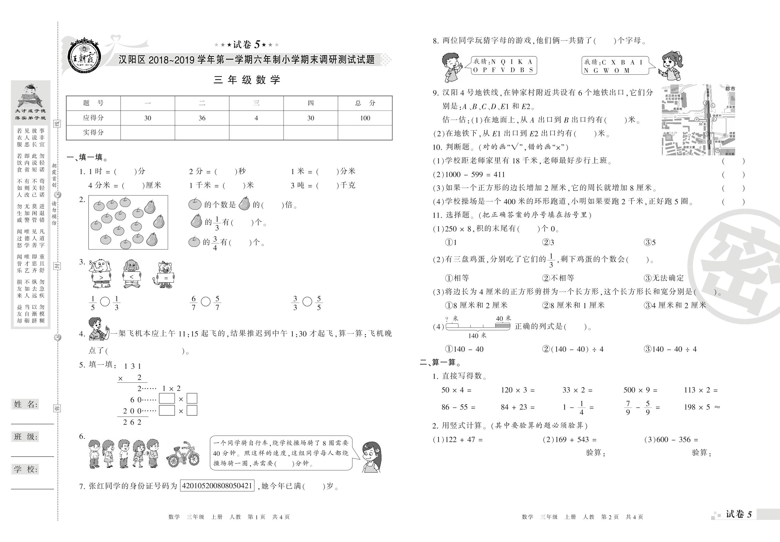 2018-2019学年第一学期武汉市汉阳区三年级数学试卷(人教版)【5】