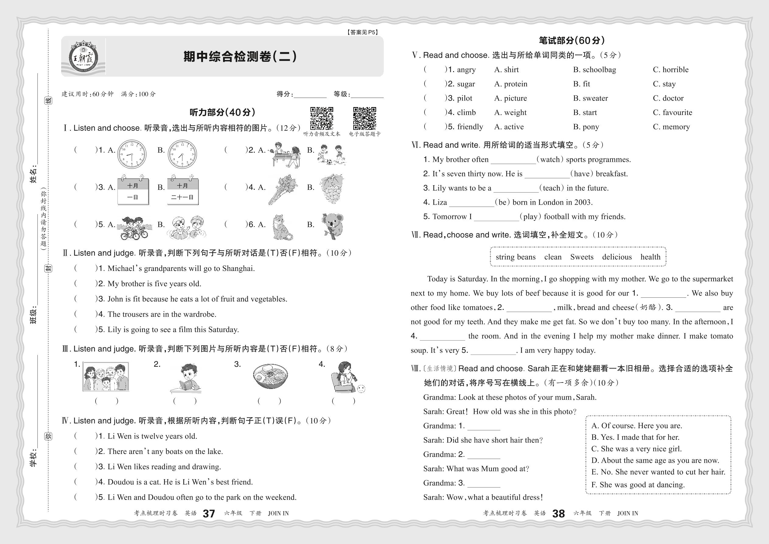 2024春下册六年级英语剑桥版 期中综合检测卷(二)