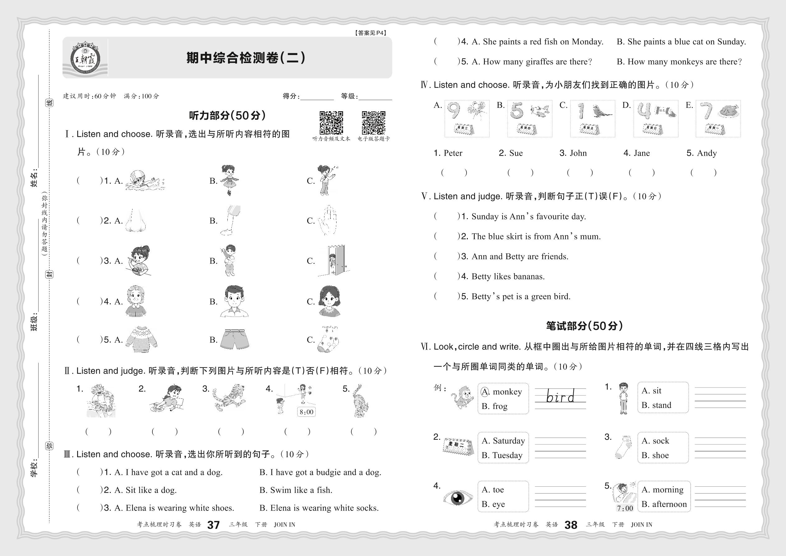 2024春下册三年级英语剑桥版 期中综合检测卷(二)