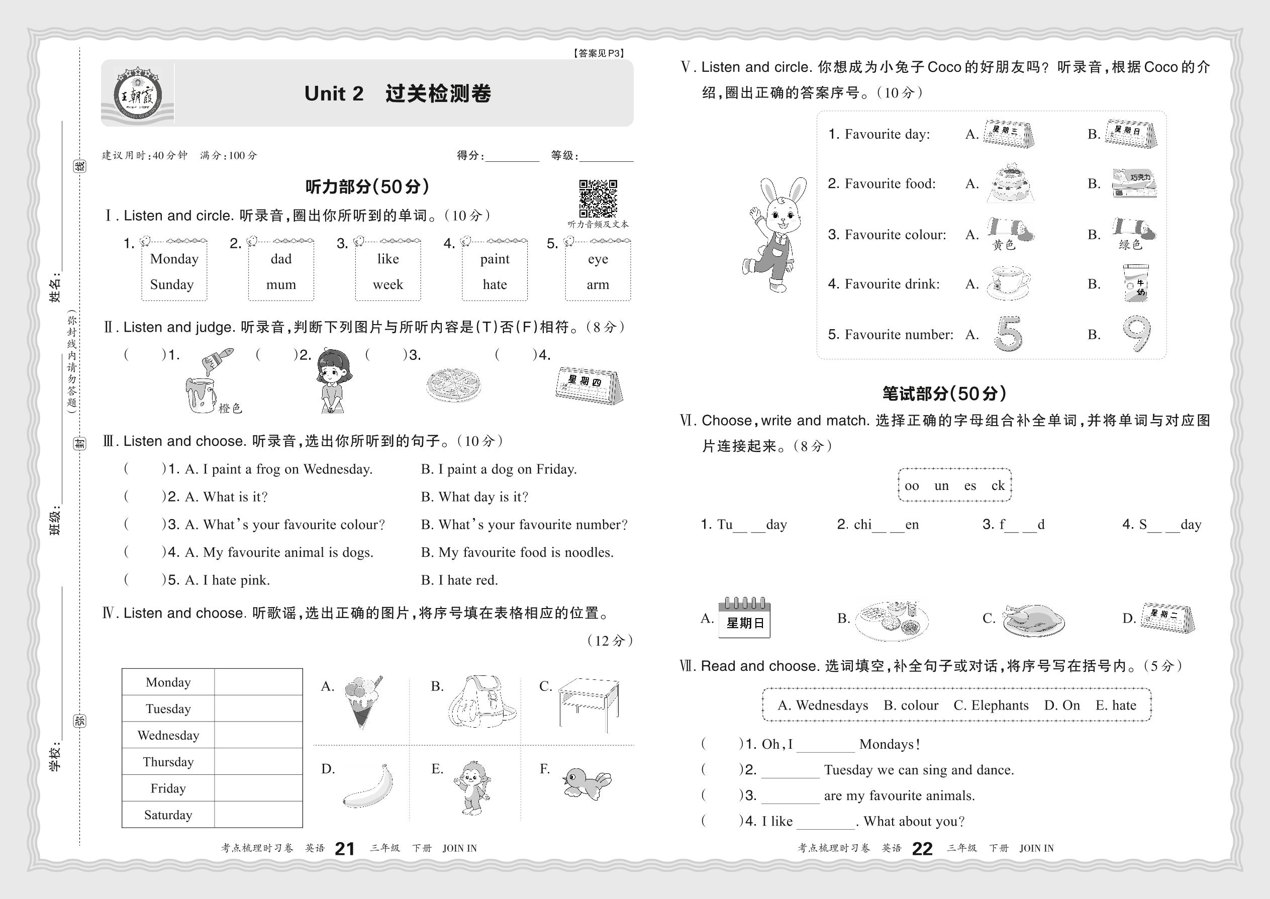 2024春下册三年级英语剑桥版 Unit 2 过关检测卷