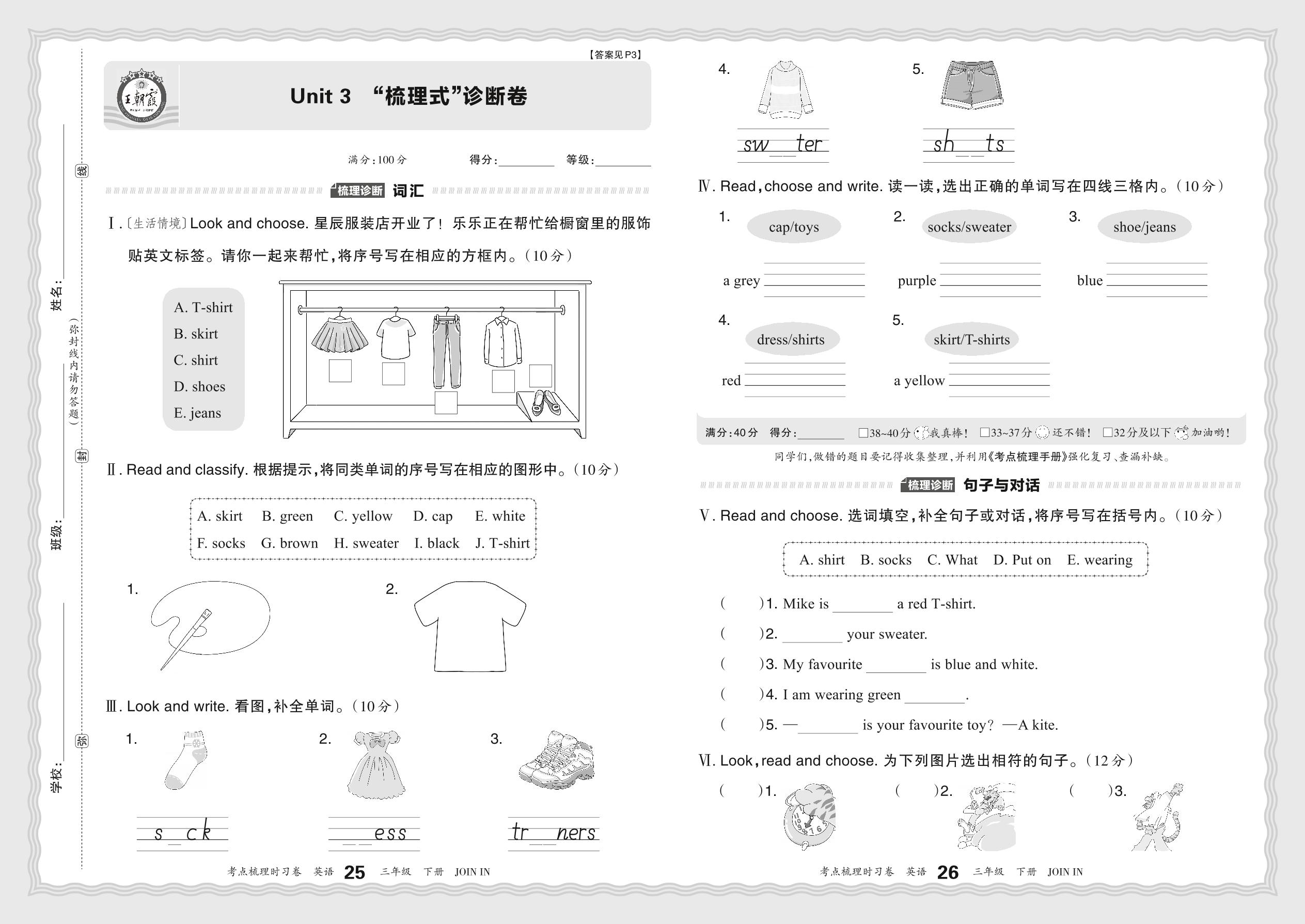 2024春下册三年级英语剑桥版 Unit 3 “梳理式”诊断卷