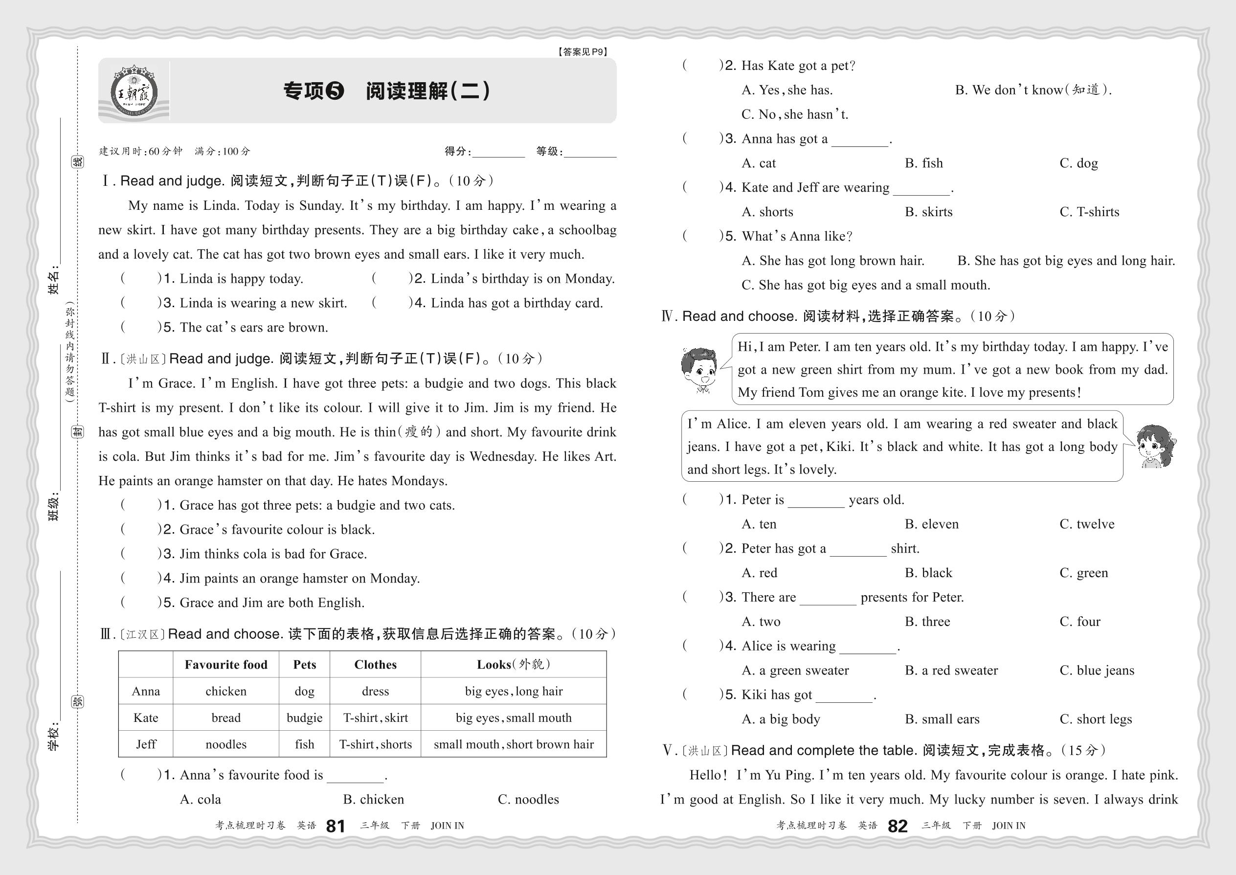 2024春下册三年级英语剑桥版 期末专项卷KD版·阅读理解(二)【5】