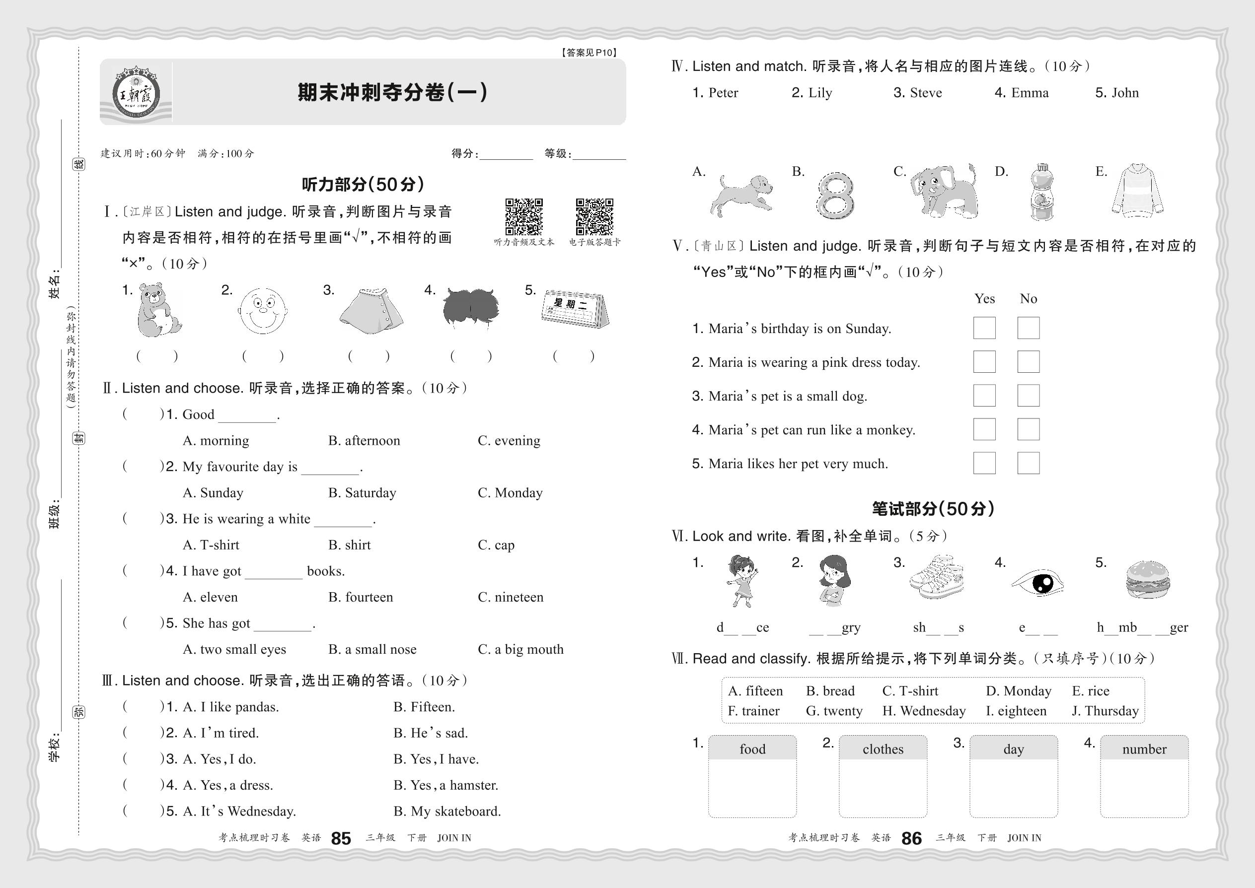 2024春下册三年级英语剑桥版 期末冲刺夺分卷(一)