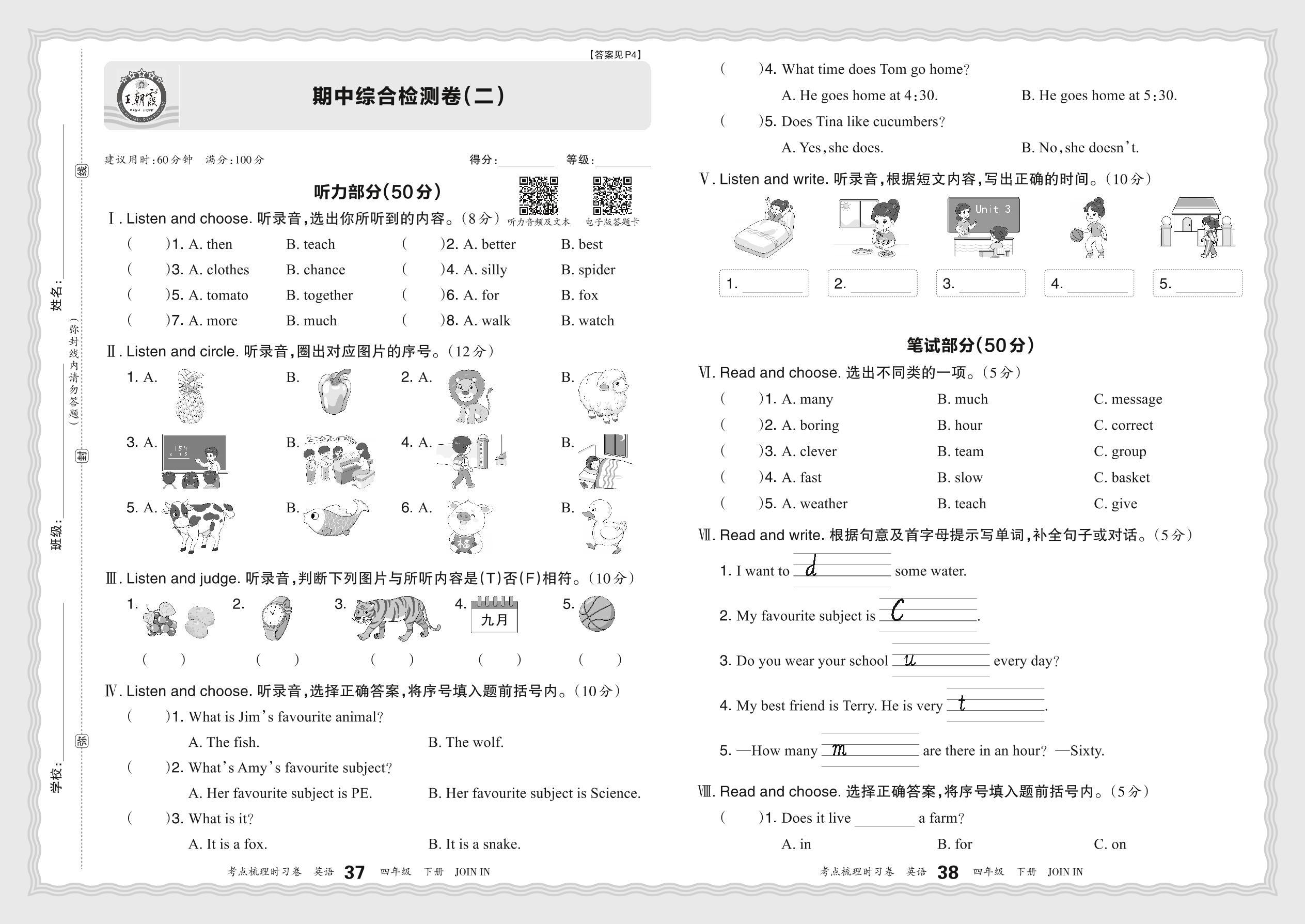 2024春下册四年级英语剑桥版 期中综合检测卷(二)
