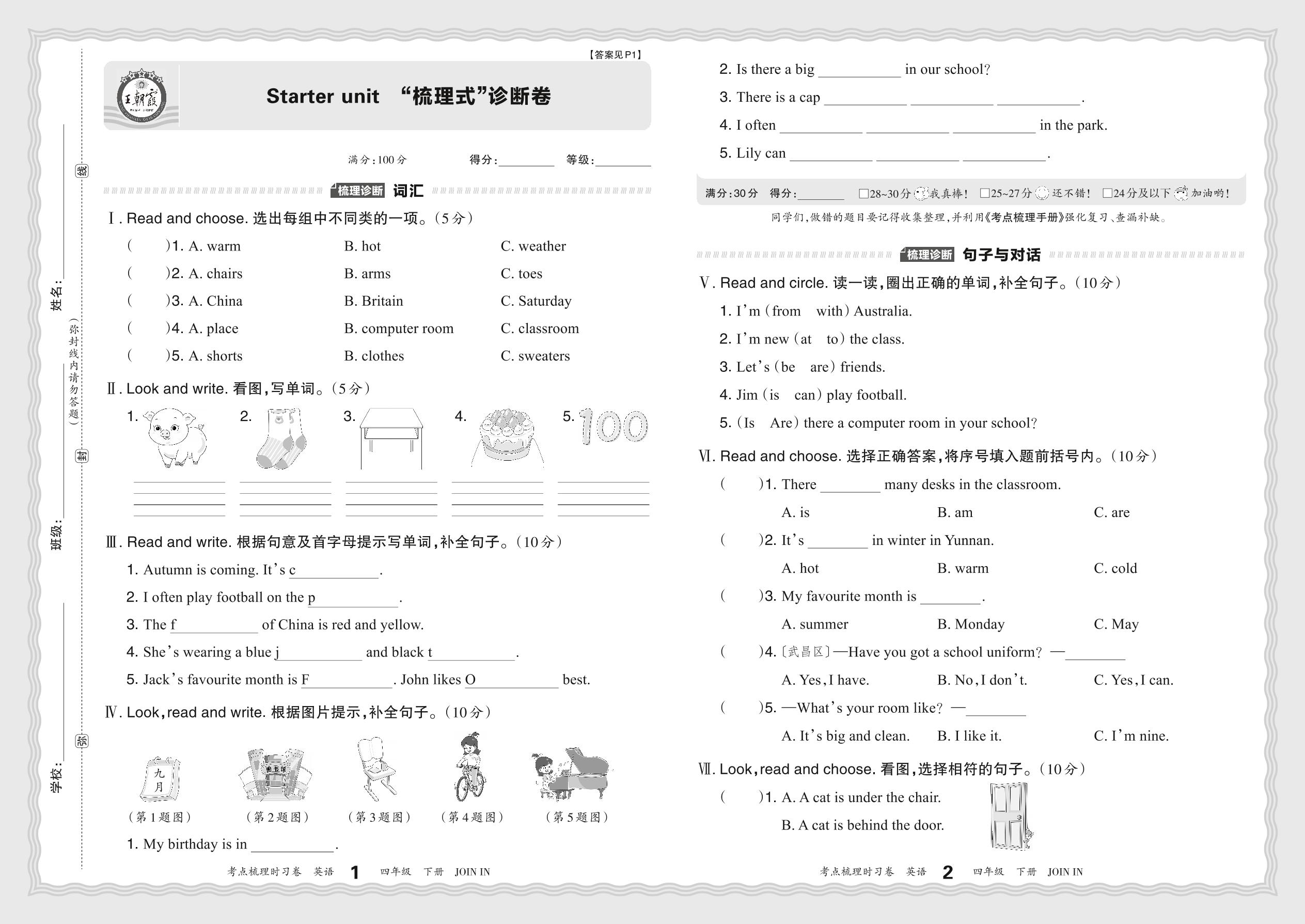 2024春下册四年级英语剑桥版 Starter unit “梳理式”诊断卷