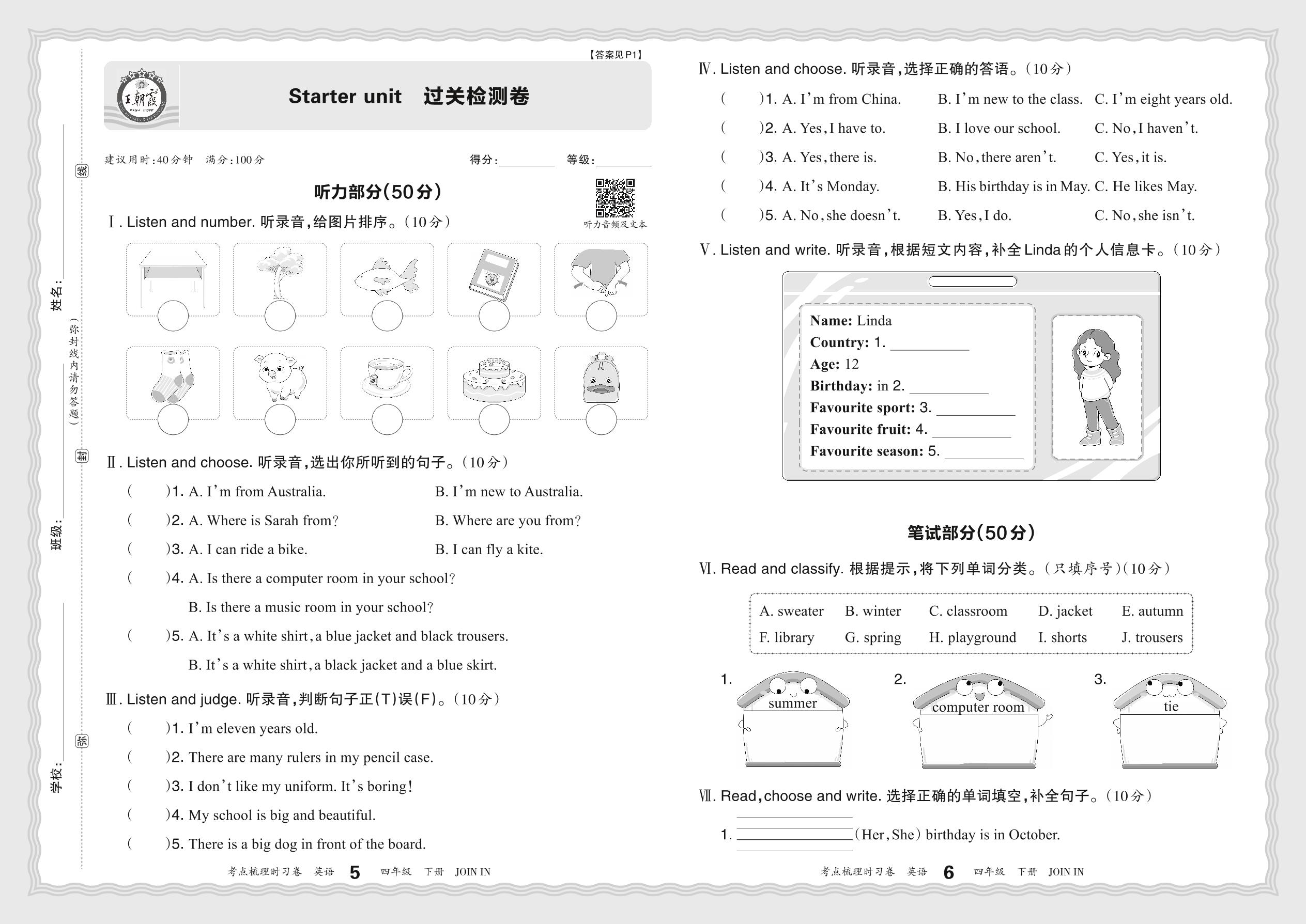 2024春下册四年级英语剑桥版 Starter unit 过关检测卷